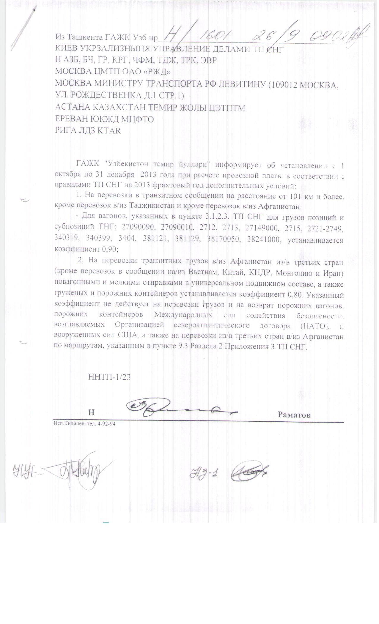 ГАЖК "Узбекистан темир нуллари" информирует об установлении с 1 октября по 31 декабря 2013 года при расчете провозной платы в соответствии правилами ТП СНГ на 2013 фрахтовый год дополнительных условий: