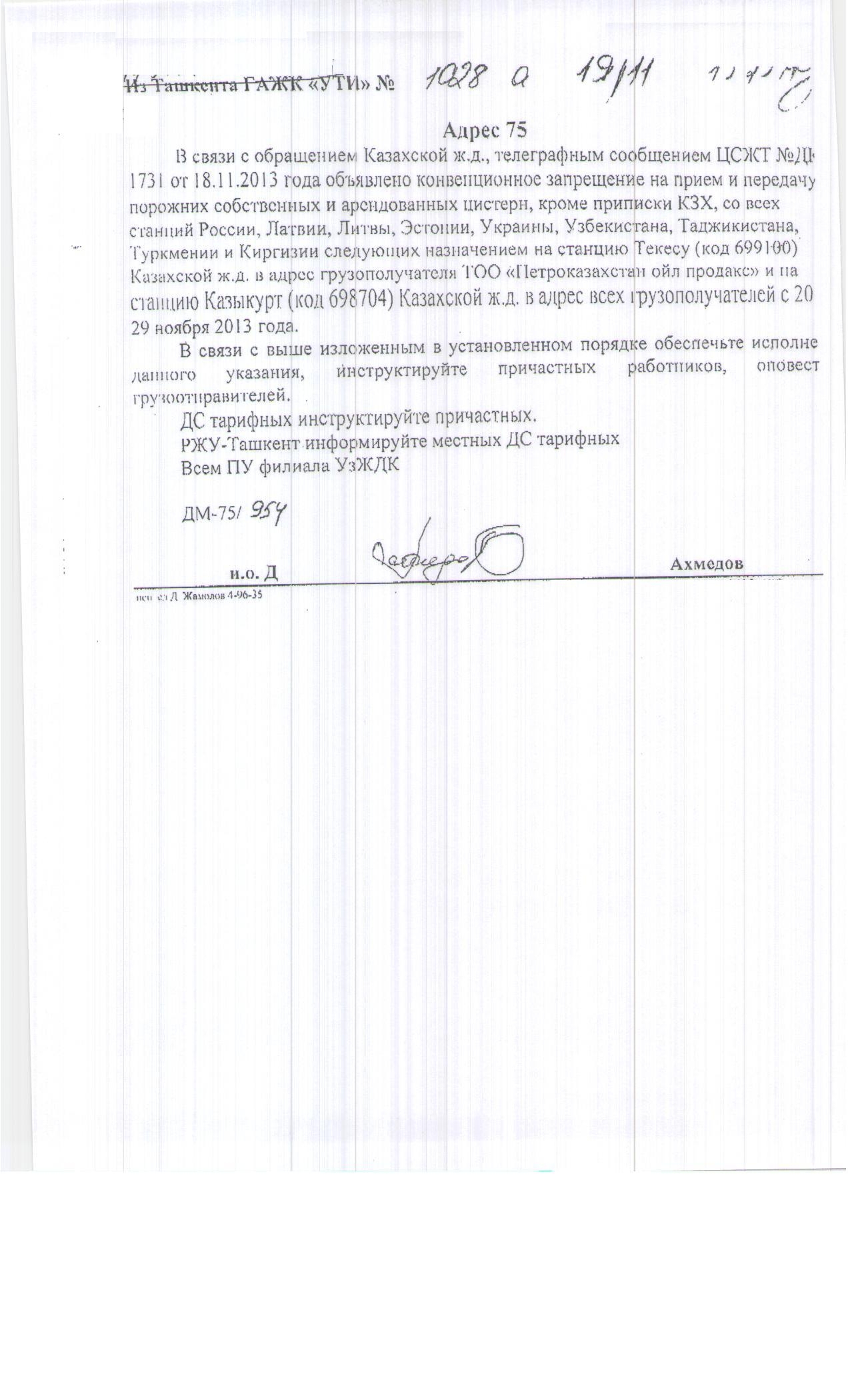 1731 от 18.11.2013 года объявлено конвенционное запрещение на прием и передачу порожних собственных и арендованных цистерн, кроме приписки КЗХ, со всех станций России, Латвии, Литвы, Эстонии, Украины, Узбекистана, Таджикистана, Туркмении и Киргизии следующих назначением на станцию Текесу (код 699100) Казахской ж.д.в адрес грузополучателя ТОО «Петроказахстан ойл продакс» и на станцию Казыкурт (код 698704) Казахской ж.д. в адрес всех грузополучателей с 20 29 ноября 2013 года. В связи с выше изложенным в установленном порядке обеспечьте исполнение данного указания, инструктируйте причастных работников, оповестите грузоотправителей. ДС тарифных инструктируйте причастных. РЖУ-Ташкент информируйте местных ДС тарифных Всем ПУ филиала УзЖДК ДМ-75/ 954 и.о. Д. Ахмедов исп Д Жамолов -1-96-35