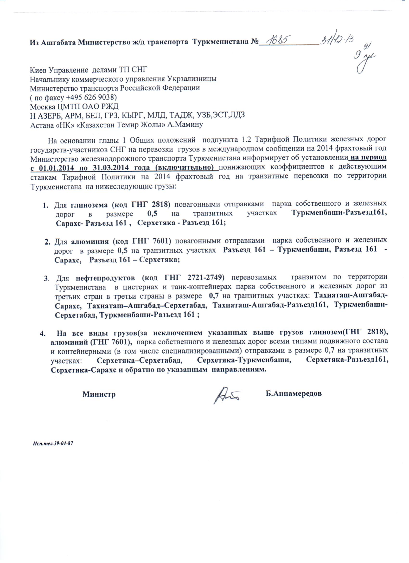 На основании главы 1 Общих положений подпункта 1.2 Тарифной Политики железных дорог государств-участников СНГ на перевозки грузов в международном сообщении на 2014 фрахтовый год Министерство железнодорожного транспорта Туркменистана информирует об установлении на период с 01.01.2014 но 31.03.2014 года (включительно) понижающих коэффициентов к действующим ставкам Тарифной Политики на 2014 фрахтовый год на транзитные перевозки по территории Туркменистана на нижеследующие грузы: