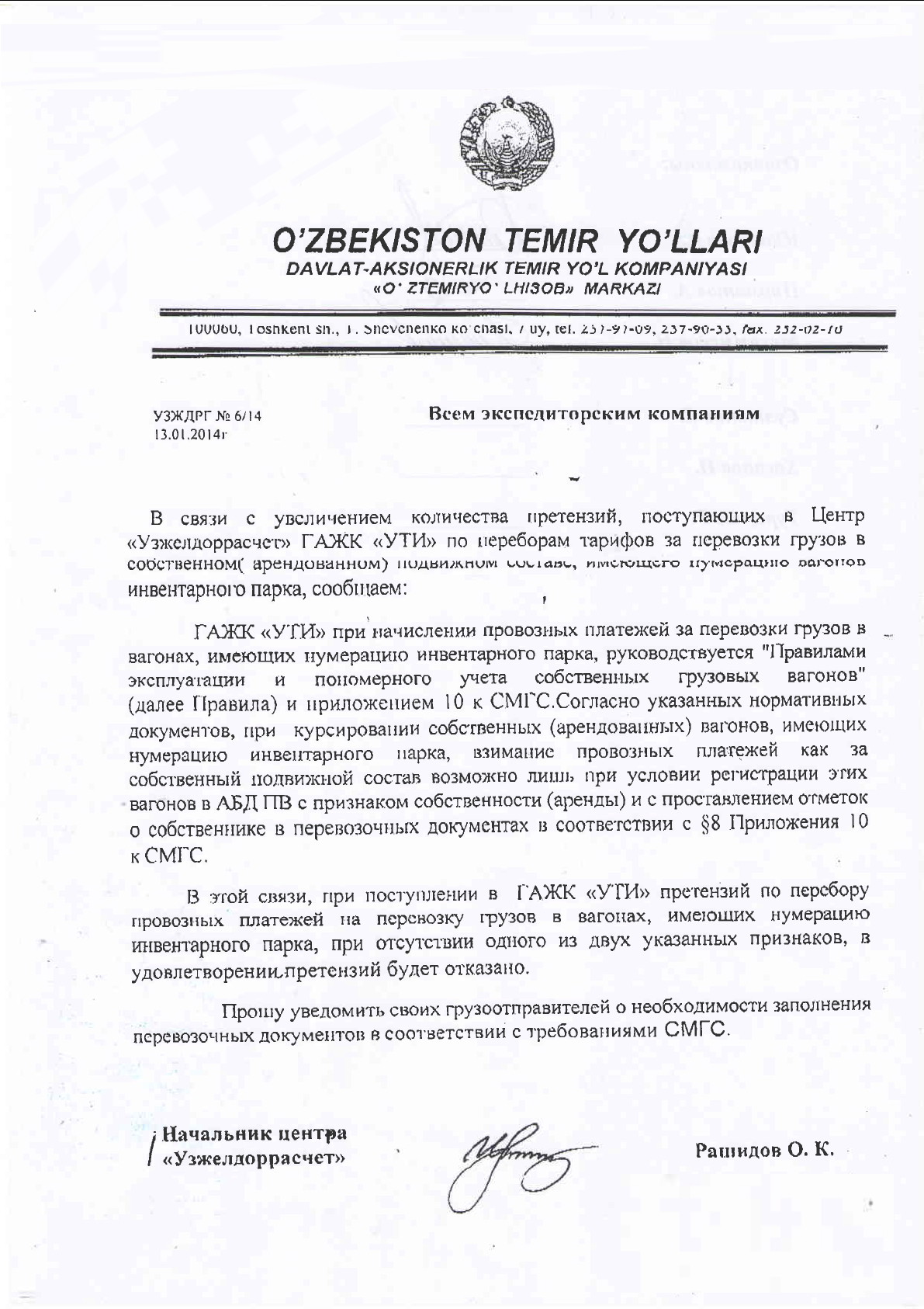 В связи с увеличением количества претензий, поступающих в Центр «Узжслдоррасчст» ГАЖК «УТИ» по переборам тарифов за перевозки грузов в собственном ( арендованном) подвижном составе имеющего нумерацию вагонов инвентарного парка, сообщаем: