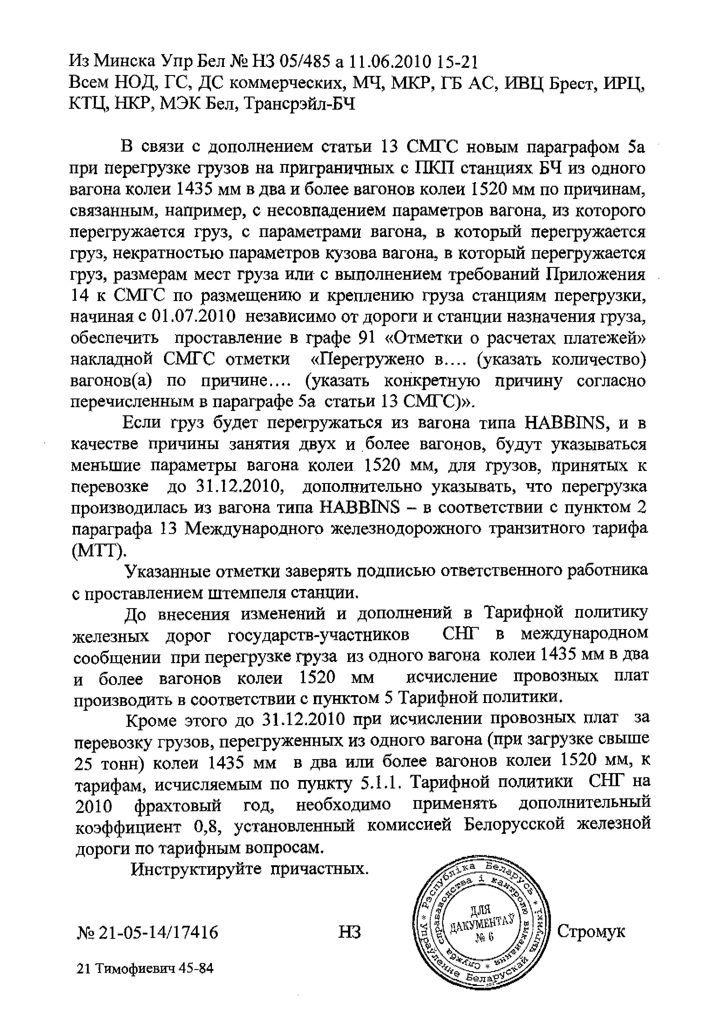 | Из Минска Упр Бел № НЗ 05/485 а 11.06.2010 15-21 Всем НОД, ГС, ДС коммерческих, МЧ, МКР, ГБ АС, ИВЦ Брест, ИРЦ, КТЦ, НКР, МЭК Бел, Трансрэйл-БЧ В связи с дополнением статьи 13 СМГС новым параграфом 5а при перегрузке грузов на приграничных с ПКП станциях БЧ из одного вагона колеи 1435 мм в два и более вагонов колеи 1520 мм по причинам, связанным, например, с несовпадением параметров вагона, из которого перегружается груз, с параметрами вагона, в который перегружается груз, не кратностью параметров кузова вагона, в который перегружается груз, размерам мест груза или с выполнением требований Приложения 14 к СМГС по размещению и креплению груза станциям перегрузки, начиная с 01.07.2010 независимо от дороги и станции назначения груза, обеспечить проставление в графе 91 «Отметки о расчетах платежей» накладной СМГС отметки «Перегружено в…(указать количество) вагонов(а) по причине…(указать конкретную причину согласно перечисленным в параграфе 5а статьи 13 СМГС)». Если груз будет перегружаться из вагона типа HABBINS, и в качестве причины занятия двух и более вагонов, будут указываться меньшие параметры вагона колеи 1520 мм, для грузов, принятых к перевозке до 31.12.2010, дополнительно указывать, что перегрузка производилась из вагона типа HABBINS – в соответствии с пунктом 2 параграфа 13 Международного железнодорожного транзитного тарифа (МТТ). Указанные отметки заверять подписью ответственного работника с проставлением штемпеля станции. До внесения изменений и дополнений в Тарифной политику железных дорог государств – участников СНГ в международном сообщении при перегрузке груза из одного вагона колеи 1435 мм в два и более вагонов колеи 1520 мм исчисление провозных плат производить в соответствии с пунктом 5 Тарифной политики. Кроме этого до 31.12.2010 при исчислении провозных плат за перевозку грузов, перегруженных из одного вагона (при загрузке свыше 25 тонн) колеи 1435 мм в два или более вагонов колеи 1520 мм, к тарифам, исчисляемым по пункту 5.1.1. Тарифной политики СНГ на 2010 фрахтовый год, необходимо применять дополнительный коэффициент 0,8, установленный комиссией Белорусской железной дороги по тарифным вопросам. Инструктируйте причастных. № 21-05-14/17416 НЗ Стромук 21 Тимофеевич 45-84 ИЗ КИЕВА НР 000178/ЦМ 11/6-10 0920= ВСIМ Н, В, ЕТЕХПД, IOЦ, ЦКРУР, НЧ, М, НФ, ДН, МЧ, ДС ВАНТАЖНИХ УКРАIНИ, ЦВСВ, ПКТБ АСУЗТ КОПIЯ: ЦМ, ЦФ, ЦД, ЦКРУ, ГIОЦ, ЦIС, РЦП, ТМСОФТ (ЕЛ.ПОШТОЮ)= У ЗВ’ЯЗКУ 3 ВВЕДЕННЯМ 3 01.07.2010 В ДТЮ ПАРАГРАФА 5-А СТАТТI 13 СМГ С IНФОРМУЕМО ПРО НЕОБХIДНIСТЬ ПРОСТАВЛЕННЯ ПРИКОРДОННИМИ СТАНЦIЯМИ В НАКЛАДНIЙ ВIДМИТОК ВИЗНАЧЕНИХ ЦИМ ПАРАГРАФОМ У ВСIХ ВИПАДКАХ, КОЛИ ВАНТАЖ ПЕРЕВАНТАЖУЕТЬСЯ ОДНОГО ВАГОНУ ШИРИНИ КОЛI I 1435 ММ ДВА ТА БIЛЬШЕ ВАГОНIВ ШИРИНИ КОЛI I 1520 ММ I СЛIДУЕ ПРИЗНАЧЕННЯМ НА СТАНЦII ЗАЛIЗНИЦЬ УКРАIНИ. ПРИ ЗАЗНАЧЕНИХ ПЕРЕВЕЗЕННЯХ РОЗРАХУНОК ПРОВIЗНИХ ПЛАТЕЖIВ (ПЛАТИ I ДОДАТКОВИХ ЗБОРIВ) ЗДIИСНЮВАТИ ЗА ПРАВИЛАМИ ЗБIРНИКА ТАРИФIВ ЗА КОЖНИЙ IЗ ВАГОНIВ ОКРЕМО, ЯК ЗА САМОСТIЙНУ ВIДПРАВКУ. ЗАБЕЗПЕЧТЕ ВИКОНАННЯ ПОЛОЖЕНЬ СМГ С ПРИ ПЕРЕВЕЗЕННI ВАНТАЖIВ ПРИЗНАЧЕННЯМ НА СТАНЦII УКРАIНИ. ЗМIНИ ВВОДЯТЬСЯ В ДIЮ З 01.07.2010 ОЗНАЙОМТЕ ПРИЧЕТНИХ. ВСТАНОВIТЬ КОНТРОЛЬ ВИКОНАННЯ. ЦЗМ-14/798= ЗАСТУПНИК ГЕНЕРАЛЬНОГО ДИРЕКТОРА ЧОРНИЙ- Я ЛЬВIВ КВ СВИЩ 11.06.2010 18:29 Я ЛЬВIВ КВ СВИЩ 11.06.2010 18:29 |