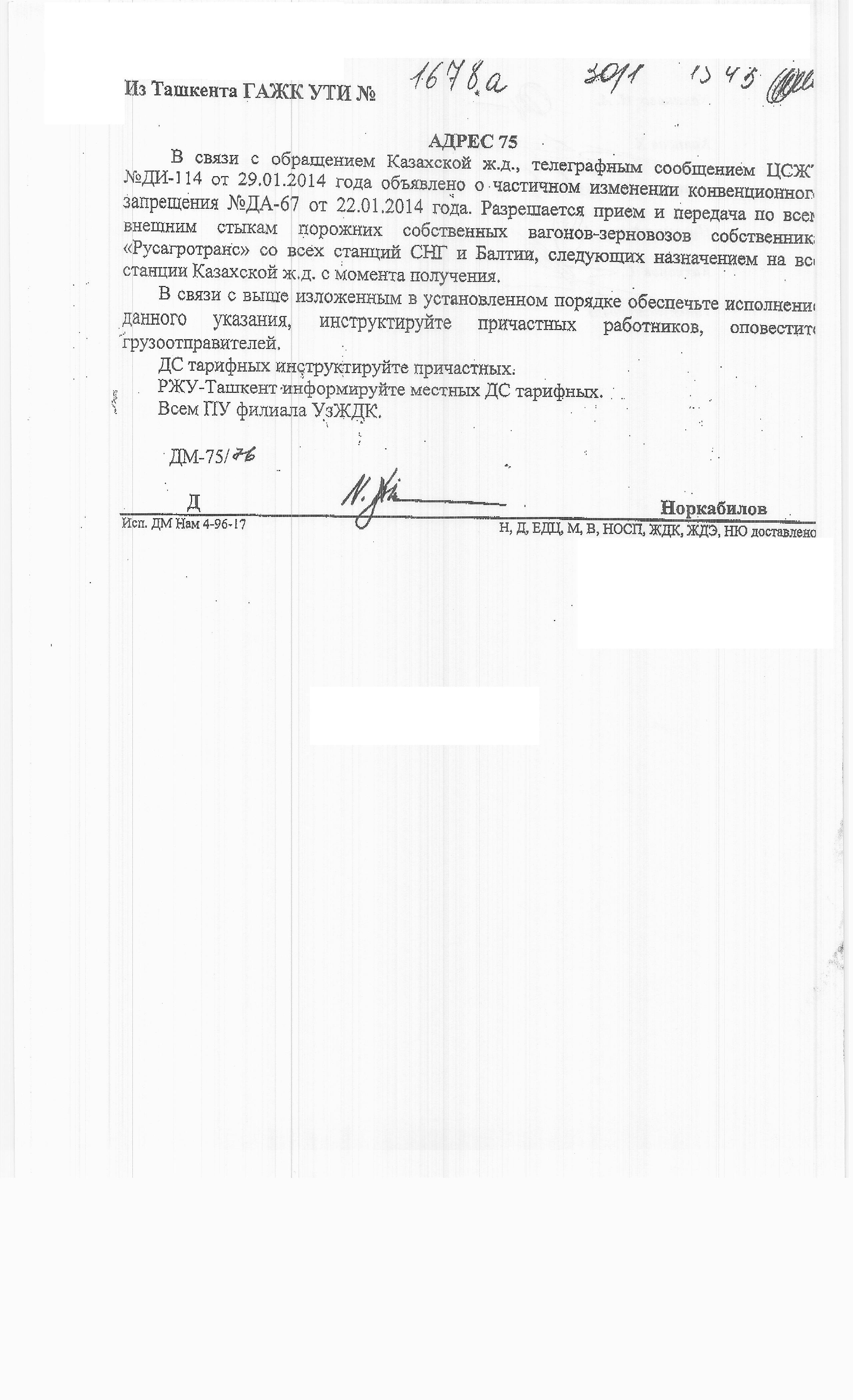 В связи с обращением Казахской ж.д., телеграфным сообщением ЦСЖ' МДИ-114 от 29.01.2014 года объявлено о частичном изменении конвенционного запрещения №ДА-67 от 22.01.2014 года. Разрешается прием и передача по всемвнешним стыкам порожних собственных вагонов-зерновозов собственник; «Русагротранс» со всех станций СНГ и Балтии, следующих назначением на все