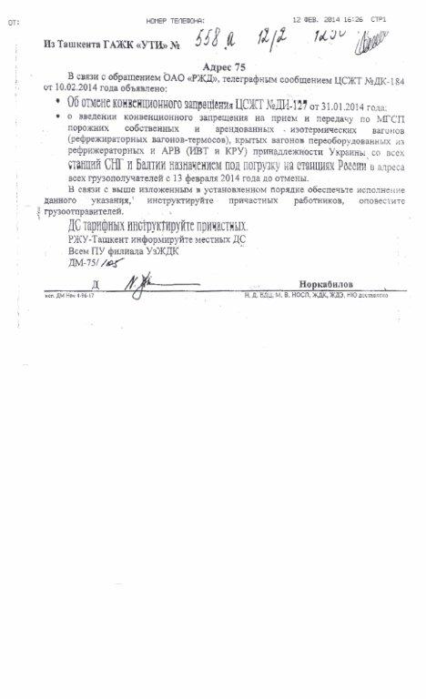 В связи с обращением ОАО «РЖД», телеграфным сообщением ЦСЖТ №ДК-184 от 10.02,2014 года объявлено: