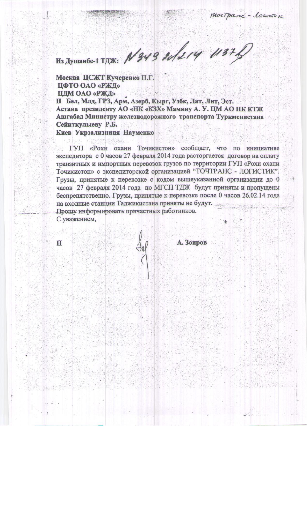 ГУП «Рохи охани Точикистон» сообщает, что по инициативе экспедитора с 0 часов 27 февраля 2014 года расторгается договор на оплату транзитных и импортных перевозок грузов по территории ГУП «Рохи охани Точикистон» с экспедиторской организацией “ТОЧТРАНС - ЛОГИСТИК”. Грузы, принятые к перевозке с кодом вышеуказанной организации до 0 часов 27 февраля 2014 года по МГСП ТДЖ будут приняты и пропущены беспрепятственно. Грузы, принятые к перевозке после 0 часов 26.02.14 года на входные станции Таджикистана приняты не будут.