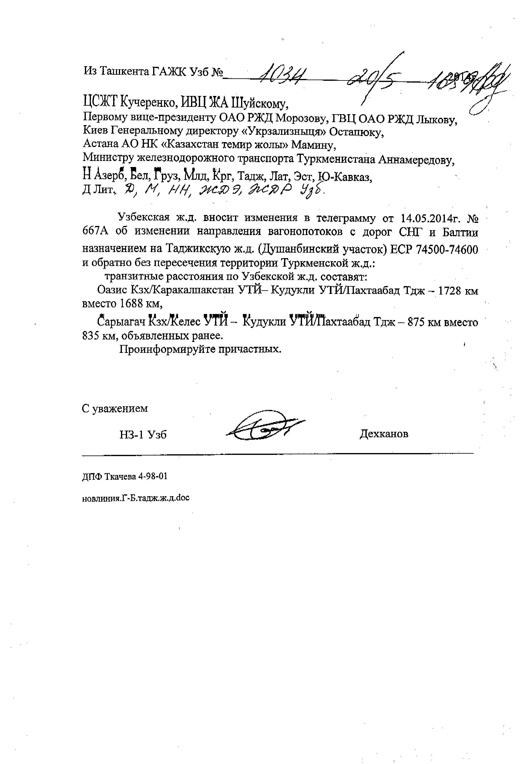 Узбекская ж.д, вносит изменения в телеграмму от 14.05,2014г. № 667А об изменении направления вагонопотоков с дорог СНГ и Балтии