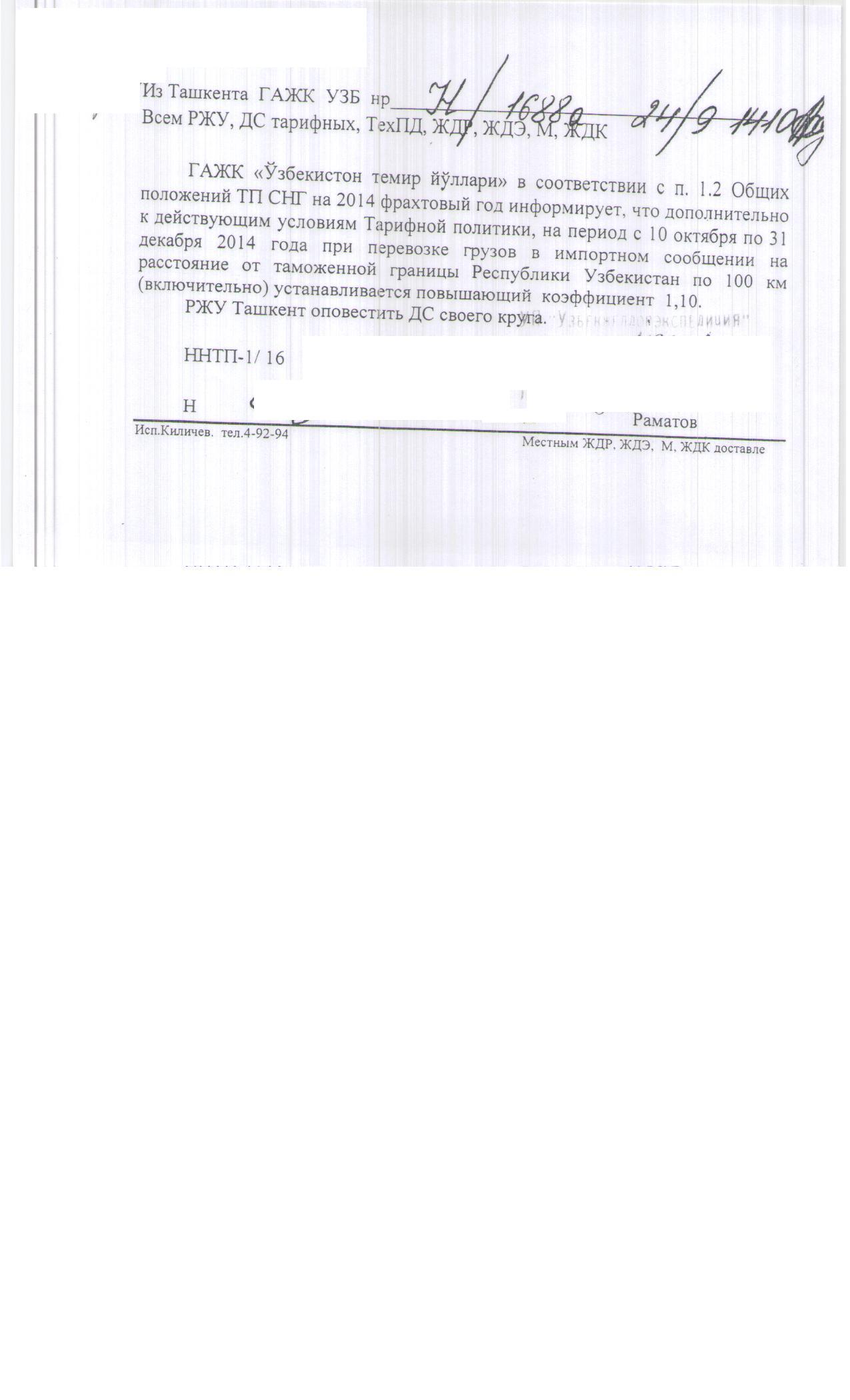 ГАЖК «Узбекистон темир йуллари» в соответствии с п. 1.2 Общих положений ТП СНГ на 2014 фрахтовый год информирует, что дополнительно к действующим условиям Тарифной политики, на период с 10 октября по 31 декабря 2014 года при перевозке грузов в импортном сообщении на расстояние от таможенной границы Республики Узбекистан по 100 км (включительно) устанавливается повышающий коэффициент 1,10.