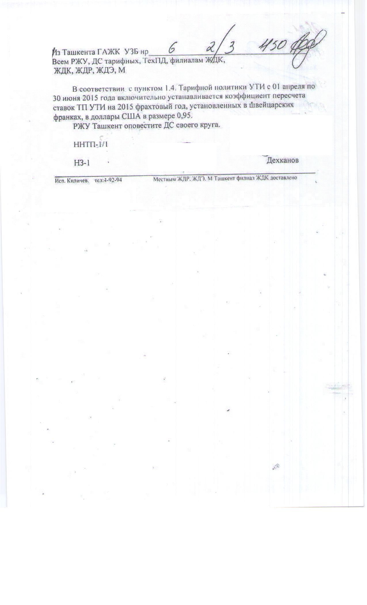 В соответствии с пунктом 1.4. Тарифной политики УТИ с 01 апреля по 30 июня 2015 года включительно устанавливается коэффициент пересчета ставок ТП УТИ на 2015 фрахтовый год, установленных в швейцарских франках, в доллары США в размере 0,95.