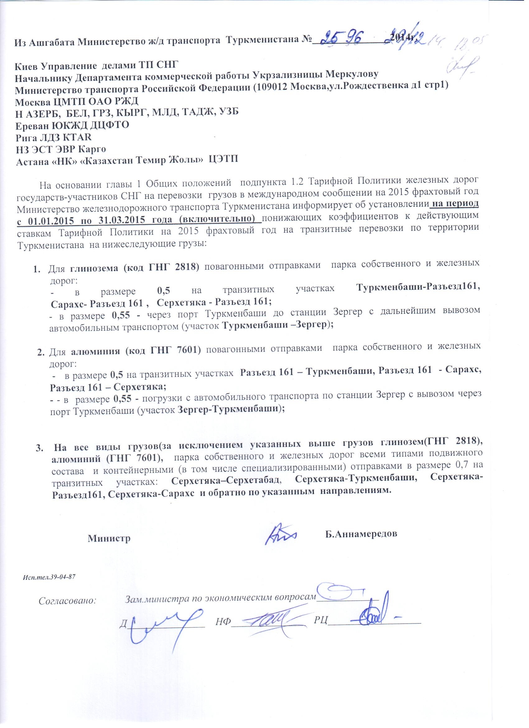 На основании главы 1 Общих положений подпункта 1.2 Тарифной Политики железных дорог государств-участников СНГ на перевозки грузов в международном сообщении на 2015 фрахтовый год Министерство железнодорожного транспорта Туркменистана информирует об установлении на период с 01.01.2015 по 31.03.2015 года (включительно) понижающих коэффициентов к действующим ставкам Тарифной Политики на 2015 фрахтовый год на транзитные перевозки по территории Туркменистана на нижеследующие грузы:
