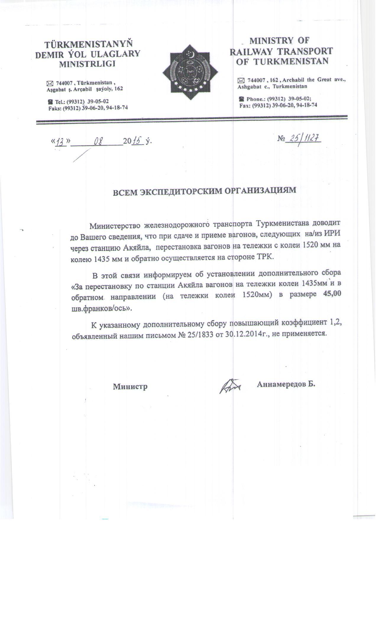 Министерство железнодорожного транспорта Туркменистана доводит до Вашего сведения, что при сдаче и приеме вагонов, следующих на/из ИРИ через станцию Акяйла, перестановка вагонов на тележки с колеи 1520 мм на колею 1435 мм и обратно осуществляется на стороне ТРК.