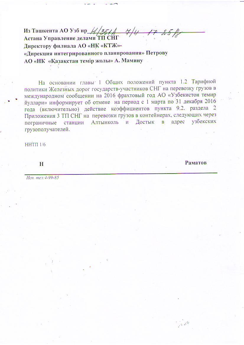 На основании главы 1 Общих положений пункта 1.2 Тарифной политики Железных дорог государств-участников СНГ на перевозку грузов в международном сообщении на 2016 фрахтовый год АО «Узбекистан темир йуллари» информирует об отмене на период с 1 марта по 31 декабря 2016 года (включительно) действие коэффициентов пункта 9.2. раздела 2 Приложения 3 ТП СНГ на перевозки грузов в контейнерах, следующих через пограничные станции Алтынколь и Достык в адрес узбекских грузополучателей.