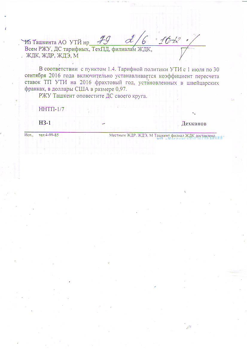 В соответствии с пунктом 1.4. Тарифной политики УТИ с 1 июля по 30 сентября 2016 года включительно устанавливается коэффициент пересчета ставок ТП УТИ на 2016 фрахтовый год, установленных в швейцарских франках, в доллары США в размере 0,97.