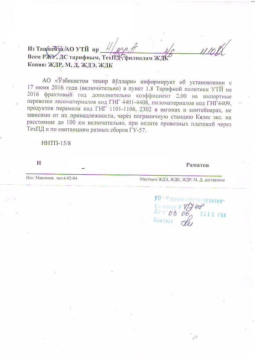 АО «Узбекистан темир йуллари» информирует об установлении с 17 июня 2016 года (включительно) в пункт 1.8 Тарифной политики УТЙ на 2016 фрахтовый год дополнительно коэффициент 2,00 на импортные перевозки лесоматериалов код ГНГ 4401-4408, пиломатериалов код ГНГ4409, продуктов перемола код ГНГ 1101-1106, 2302 в вагонах и контейнерах, не зависимо от их принадлежности, черёз пограничную станцию Келес экс. на расстояние до 100 км включительно, при оплате провозных платежей через ТехПД и по квитанциям разных сборов ГУ-57.