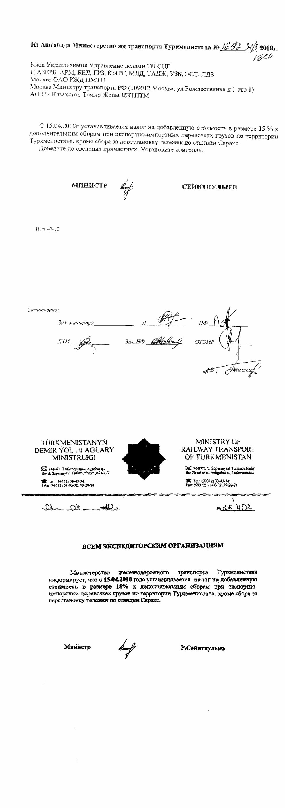 Из Ашгабада Министерство жд транспорта Туркменистана № 1697 31/3 2010г. 18:50