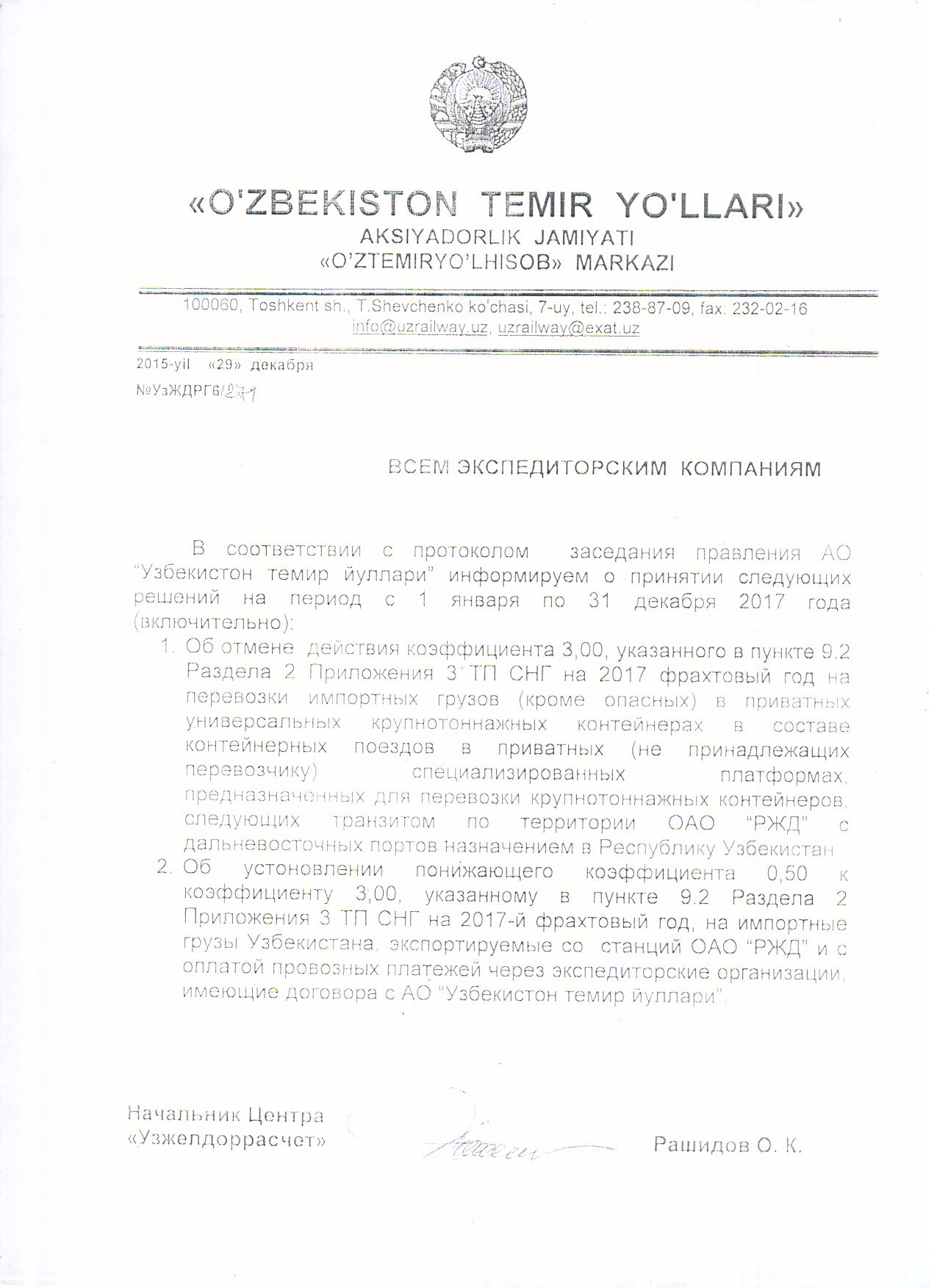 В соответствии с протоколом заседания правления АО "Узбекистон темир йуллари" информируем о принятии следующих решений на период с 1 января по 31 декабря 2017 года (включительно): 1. Об отмене действия коэффициента 3,00, указанного s пункте 9.2 Раздела 2 Приложения 3' ТП СНГ на 2.017 фрахтовый год на перевозки импортных грузов (кроме опасных) в приватных универсальных крупнотоннажных контейнерах Составе контейнерных поездов в приватных (не принадлежащих перевозчику) специализированых платформах предназначенных для перевозки крупнотоннажных контейнеров. следующих транзитом по территории ОАО "РЖД" с дальневосточных портов назначением в Республику Узбекистан 2. Об установлении понижающего коэффициенте 0,50 к коэффициенту 3.,00, указанному в пункте 9.2 Раздела 2 Приложения 3 ТП СНГ на 2017-й фрахтовый гад, на импортные грузы Узбекистана, экспортируемые со станций ОАО РЖД и с оплатой провозных платежей через экспедиторские организации, имеющие договора с АО "Узбекистон темир йуллари".