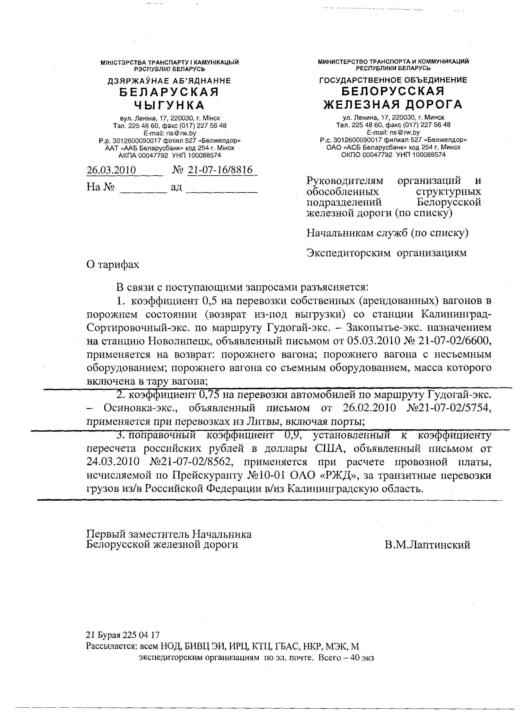 В связи с поступающими запросами разъясняется: 1. коэффициент 0,5 на перевозки собственных (арендованных) вагонов в порожнем состоянии (возврат из-под выгрузки) со станции Калининград-Сортировочный-экс. по маршруту Гудогай-экс. – Закопытье-экс. назначением на станцию Новолипецк, объявленный письмом от 05.03.2010 № 21-07-02/6600, применяется на возврат: порожнего вагона; порожнего вагона с несъемным оборудованием; порожнего вагона со съемным оборудованием, масса которого включена в тару вагона; 2. коэффициент 0,75 на перевозки автомобилей по маршруту Гудогай-экс. – Осиновка-экс., объявленный письмом от 26.02.2010 №21-07-02/5754, применяется при перевозках из Литвы, включая порты; 3. поправочный коэффициент 0,9, установленный к коэффициенту пересчета российских рублей в доллары США, объявленный письмом от 24.03.2010 №21-07-02/8562, применяется при расчете провозной платы, исчисляемой по Прейскуранту №10-01 ОАО «РЖД», за транзитные перевозки грузов из/в Российской Федерации в/из Калининградскую область.