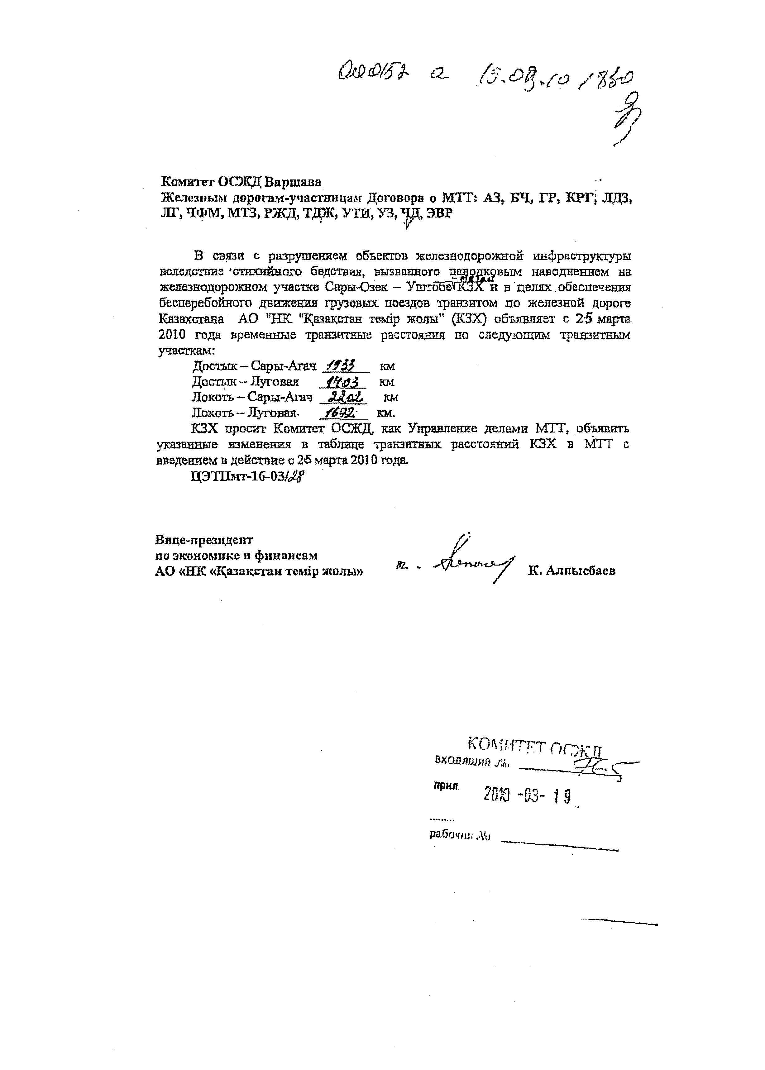 Достык – Сары – Агач 1933 км Достык – Луговая 1403 км Локоть – Сары – Агач 2202 км Локоть – Луговая 1672 км. КЗХ просит Комитет ОСЖД, как Управление делами МТТ, объявить указанные изменения в таблице транзитных расстояний КЗХ в МТТ с введением в действие с 25 марта 2010 года.