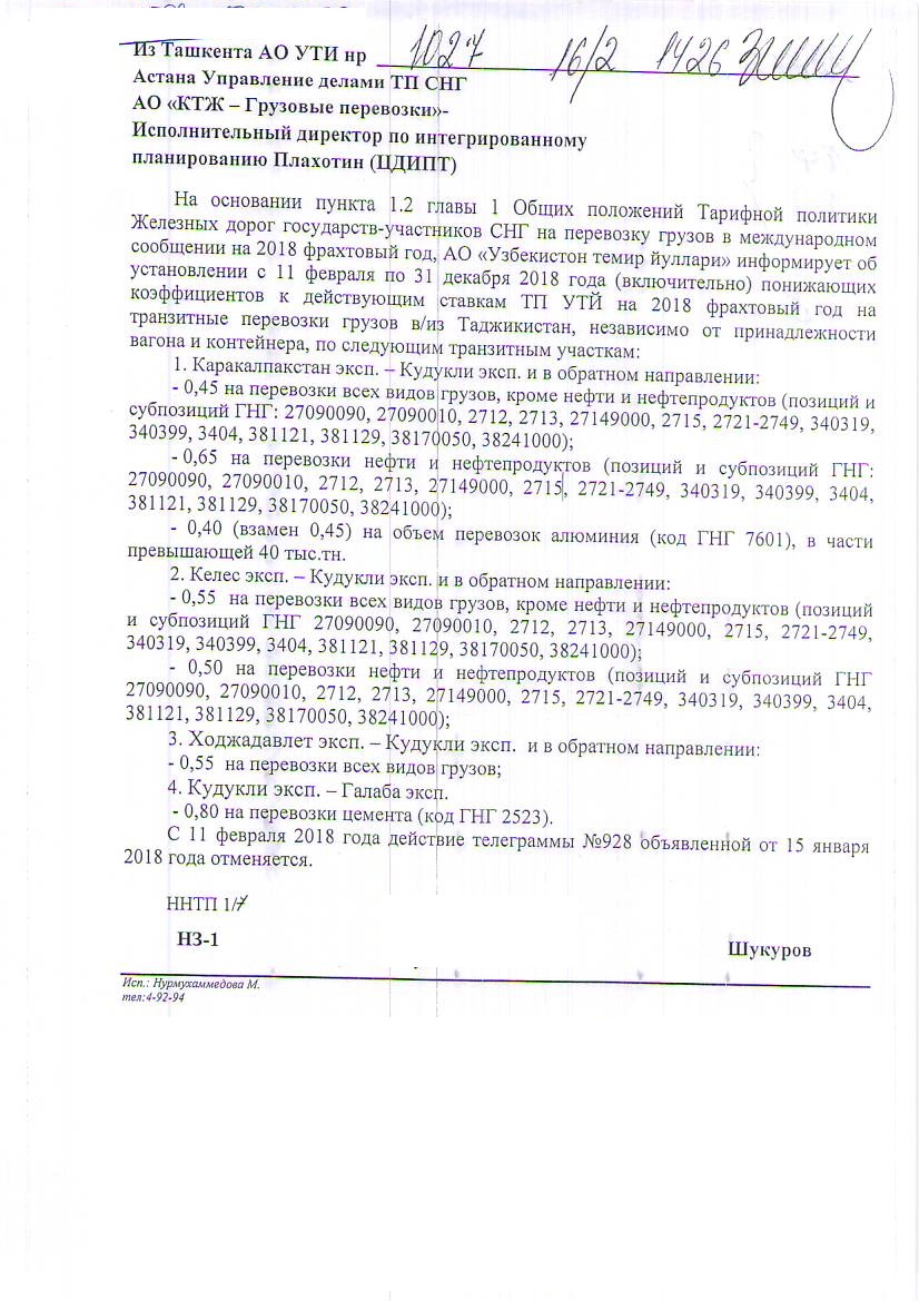 "Из Ташкента АО УТИ нр 1027 16/2 1426