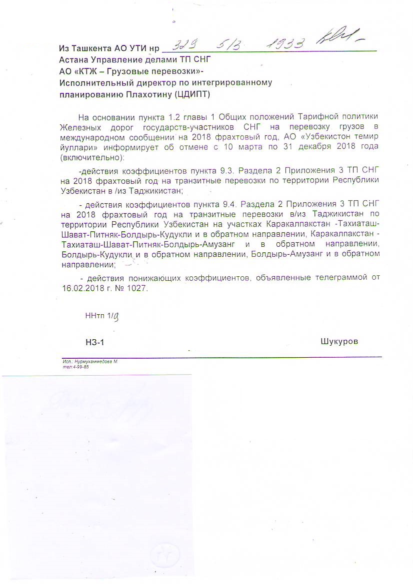 На основании пункта 1.2 главы 1 Общих положений Тарифной политики Железных дорог государств-участников СНГ на перевозку грузов международном сообщении на 2018 фрахтовый год. АО «Узбекистон темир йуллари» информирует об отмене с 10 марта по 31 декабря 2018 года (включительно):