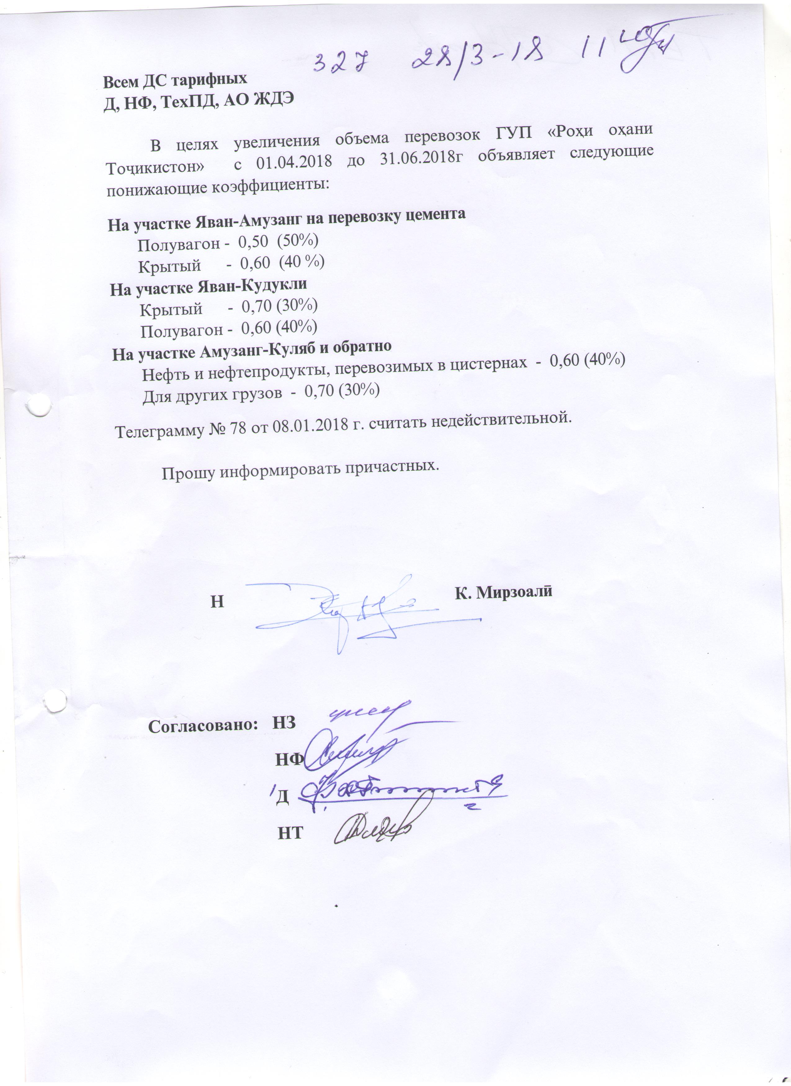 В целях увеличения объема перевозок ГУП «Рохи охани Точикистон» с 01.04.2018 до 31.06.2018г объявляет следующие понижающие коэффициенты: