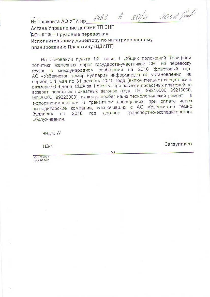 На основании пункта 1.2 главы 1 Общих положений Тарифной политики железных дорог государств-участников СНГ на перевозку грузов в международном сообщении на 2018 фрахтовый год, АО «Узбекистон темир йуллари» информирует об установлении на период с 1 мая по 31 декабря 2018 года (включительно) спецставки в размере 0,09 долл. США за 1 осе-км. при расчете провозных платежей на возврат порожних приватных вагонов (кода ГНГ 99210000, 99213000, 99220000, 99223000), включая пробег на/из технологический ремонт в экспортно-импортном и транзитном сообщениях, при оплате через экспедиторские компании, заключивших с АО «Узбекистон темир йуллари» на 2018 год договор транспортно-экспедиторского обслуживания.