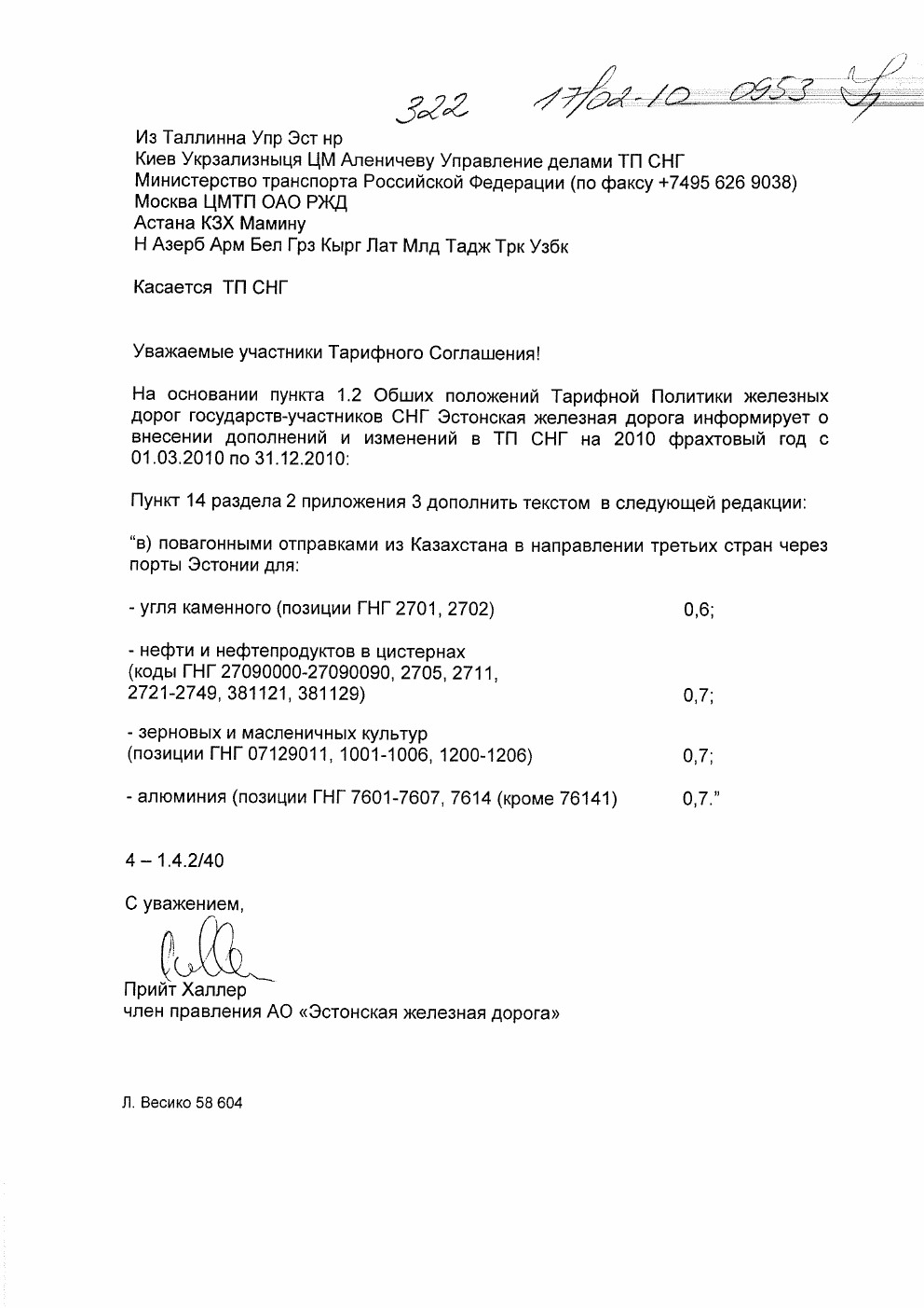 | Из Таллина Упр Эст нр 322 17/02 – 10 09:53 Киев Укрзализныця ЦМ Аленичеву Управление делами ТП СНГ Министерство транспорта Российской Федерации (по факсу +7495 626 9038) Москва ЦМТП ОАО РЖД Астана КЗХ Мамину Н Азерб Арм Бел Грз Кырг Лат Млд Тадж Трк Узбк