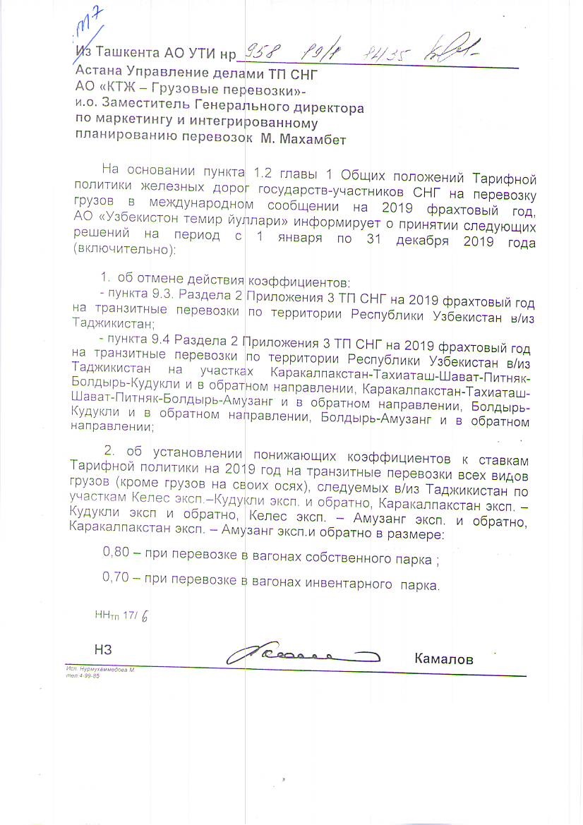 Из Ташкента АО УТИ нр 958 19/01 1435