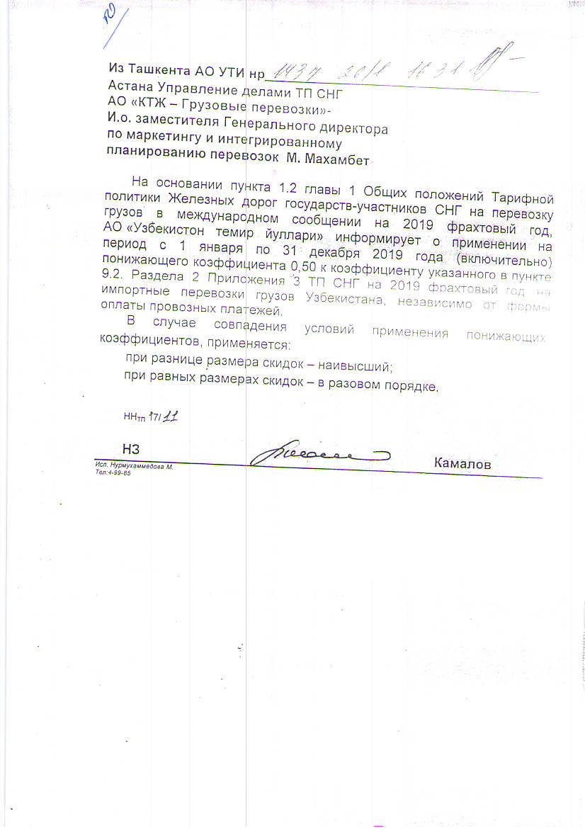 СНГ на перевозку грузов в международном сообщении на 2019 фрахтовый год, АО «Узбекистан темир йуллари» информирует о