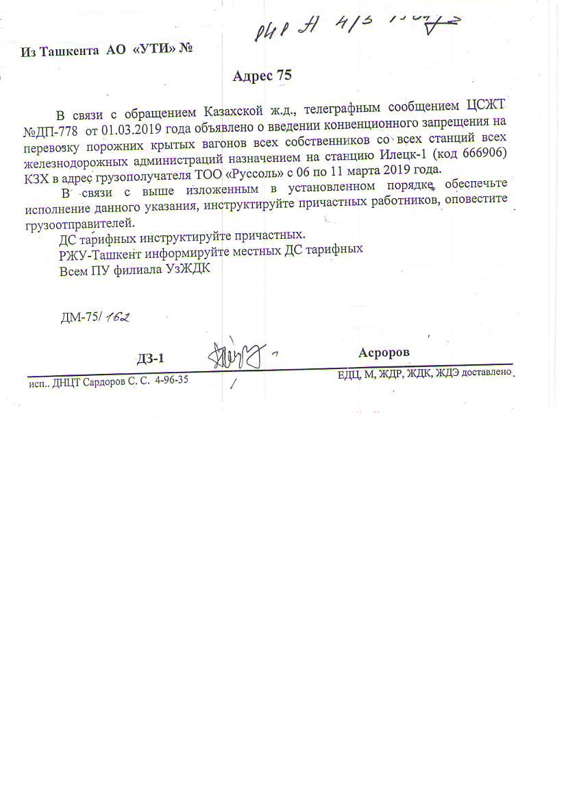 В связи с обращением Казахской ж.д., телеграфным сообщением ЦСЖТ №ДП-778 от 01.03.2019 года