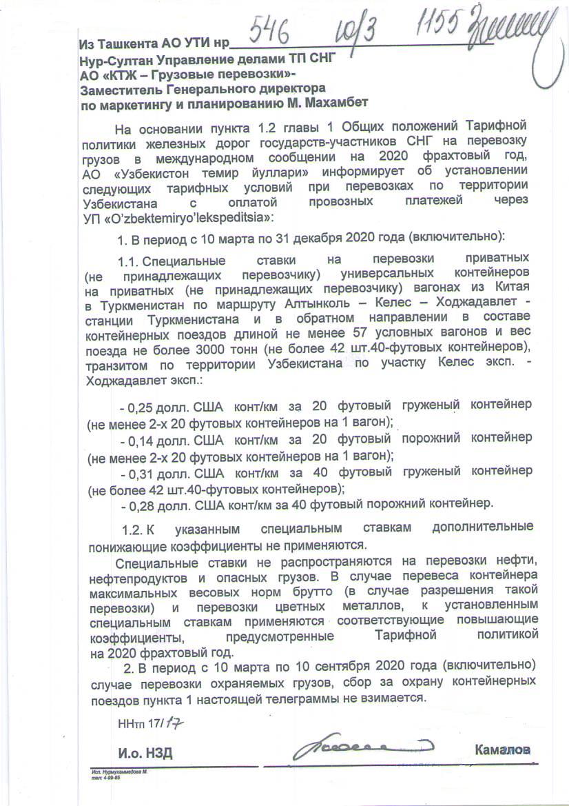 международном сообщении на 2020 фрахтовый год, АО «Узбекистан темир йуллари» информирует об установлении следующих тарифных