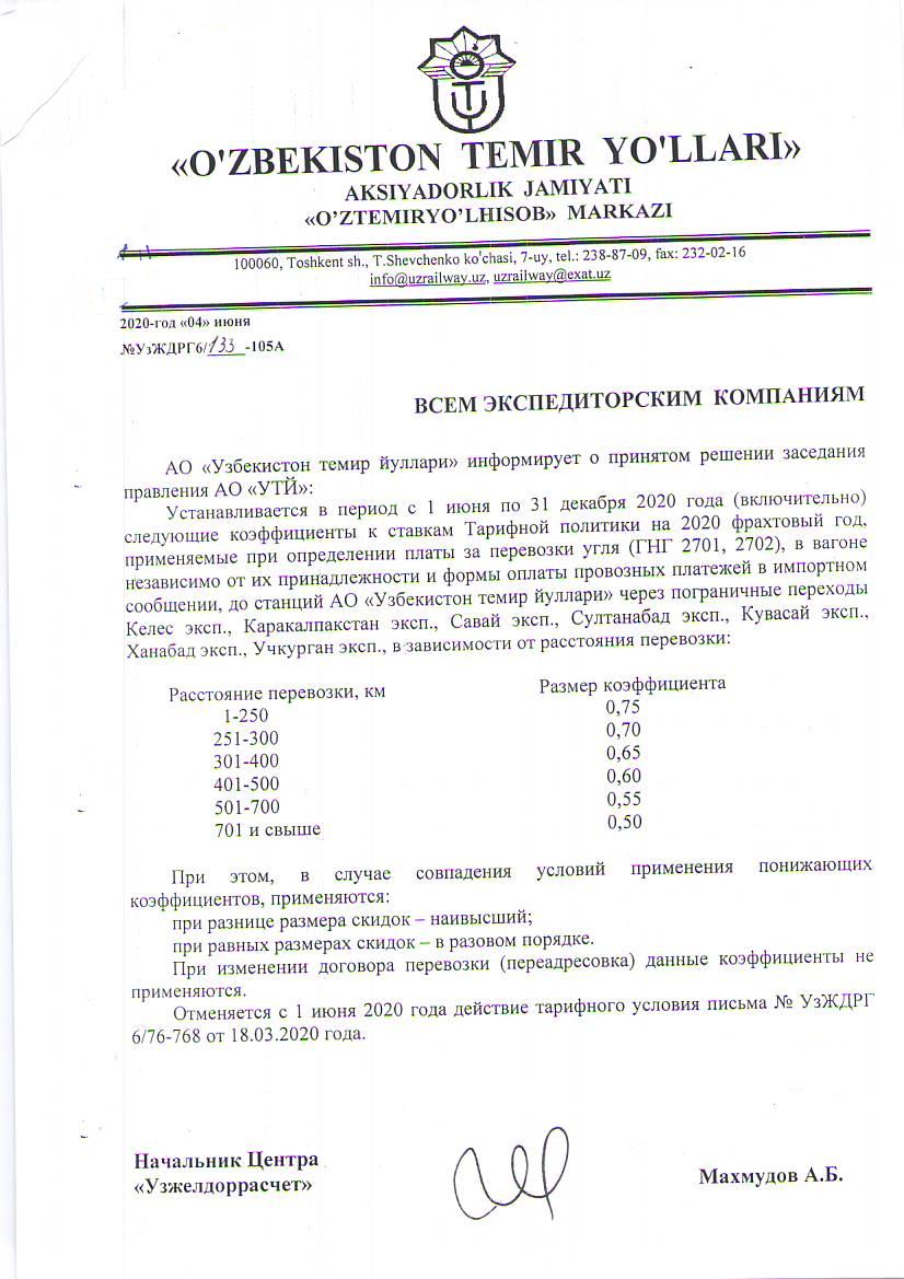 Отменяется с 1 июня 2020 года действие тарифного условия письма № УзЖДРГ 6/76-768 от 18.03.2020 года.