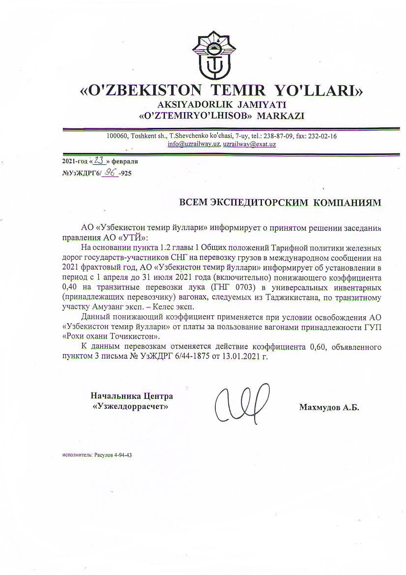 К данным перевозкам отменяется действие коэффициента 0,60, объявленного пунктом 3 письма № УзЖДРГ 6/44-1875 от 13.01.2021г.