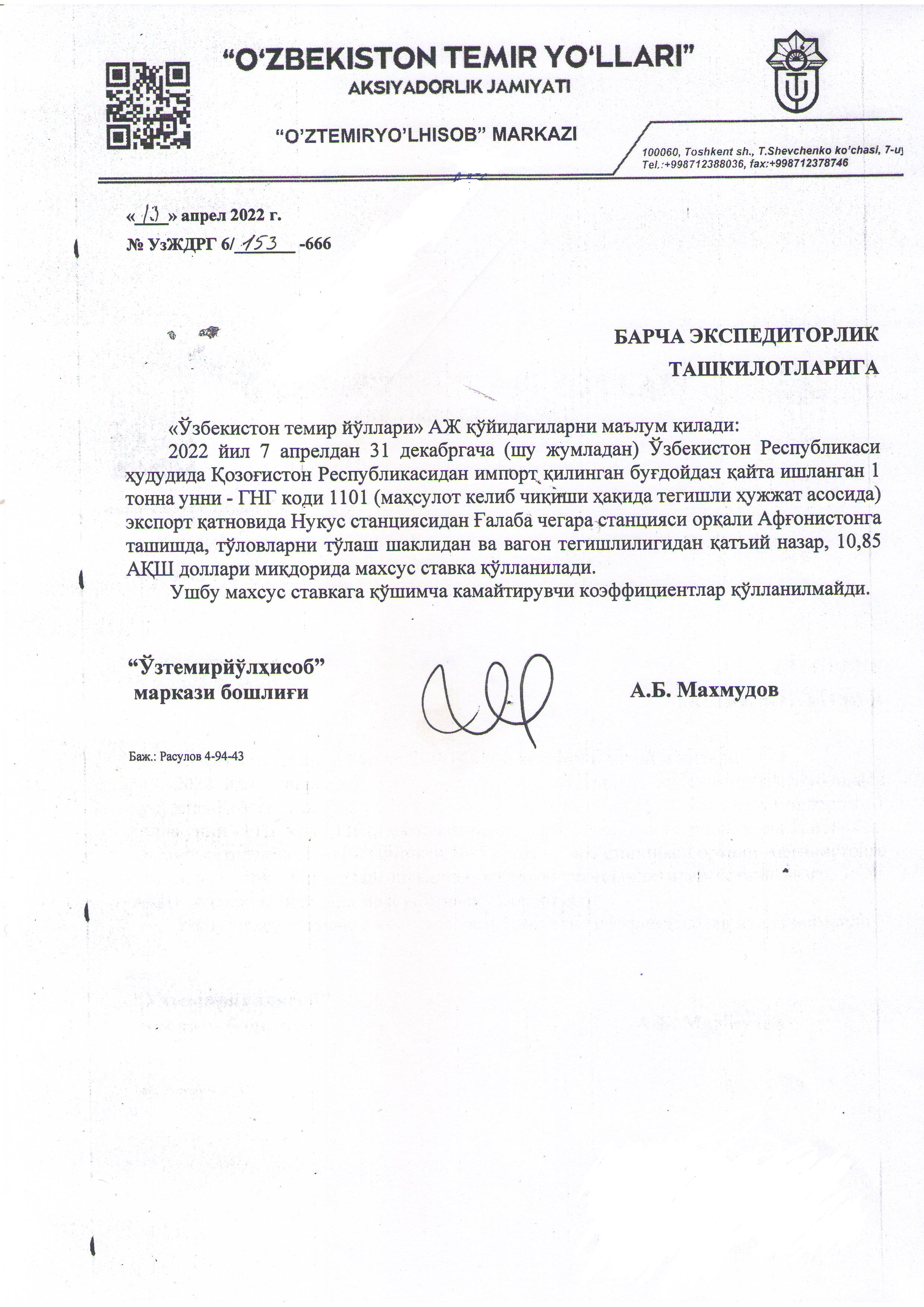2022 йил 7 апрелдан 31 декабргача (шу жумладан) Узбекистон Республикаси худудида Крзогистон Республикасидан импорт килинган бугдойдан кайта ишланган 1 тонна унни - ГНГ коди 1101 (махсулот келиб чикиши хакида тегишли хужжат асосида) экспорт катновида Нукус станциясидан Галаба чегара станцияси оркали Афгонистонга ташишда, туловларни тушаш шаклидан ва вагон тегишлилигидан катьий назар, 10,85 АКШ доллары микдорида махсус ставка кулланилади.