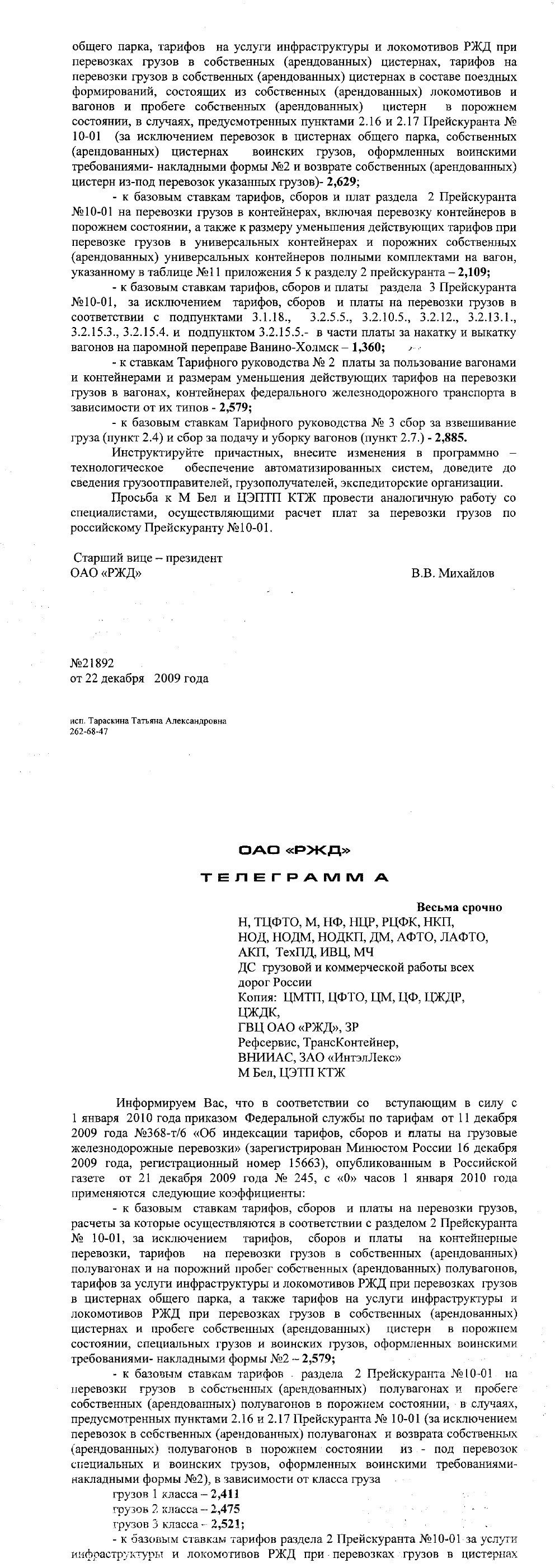 Весьма срочно Н, ТЦФТО, М, НФ, НЦР, РЦФК, НКП, НОД, НОДМ, НОДКП, ДМ, АФТО, ЛАФТО, АКП, ТехПД, ИВЦ, МЧ ДС грузовой и коммерческой работы всех дорог России Копия: ЦМТП, ЦФТО, ЦМ, ЦФ, ЦЖДР, ЦЖДК, ГВЦ ОАО «РЖД», ЗР Рефсервис, ТрансКонтейнер, ВНИИАС, ЗАО «ИнтэлЛекс» М Бел, ЦЭТП КТЖ Информируем Вас, что в соответствии со вступающим в силу с 1 января 2010 года приказом Федеральной службы по тарифам от 11 декабря 2009 года №368-т/6 «Об индексации тарифов, сборов и платы на грузовые железнодорожные перевозки» (зарегистрирован Минюстом России 16 декабря 2009 года, регистрационный номер 15663), опубликованным в Российской газете от 21 декабря 2009 года № 245, с «0» часов 1 января 2010 года применяются следующие коэффициенты: - к базовым ставкам тарифов, сборов и платы на перевозки грузов, расчеты за которые осуществляются в соответствии с разделом 2 Прейскуранта № 10-01, за исключением тарифов, сборов и платы на контейнерные перевозки, тарифов на перевозки грузов в собственных (арендованных) полувагонах и на порожний пробег собственных (арендованных) полувагонов, тарифов за услуги инфраструктуры и локомотивов РЖД при перевозках грузов в цистернах общего парка, а также тарифов на услуги инфраструктуры и локомотивов РЖД при перевозках грузов в собственных (арендованных) цистернах и пробеге собственных (арендованных) цистерн в порожнем состоянии, специальных грузов и воинских грузов, оформленных воинскими требованиями- накладными формы №2 - 2,579; - к базовым ставкам тарифов - раздела 2 Прейскуранта №10-01 на перевозки грузов в собственных (арендованных) полувагонах и пробеге собственных (арендованных) полувагонов в порожнем состоянии, в случаях, предусмотренных пунктами 2.16 и 2.17 Прейскуранта № 10-01 (за исключением перевозок в собственных (арендованных) полувагонах и возврата собственных (арендованных) полувагонов в порожнем состоянии из - под перевозок специальных и воинских грузов, оформленных воинскими требованиями-накладными формы №2), в зависимости от класса груза грузов 1 класса-2,411 грузов 2 класса-2,475 грузов 3 класса- 2,521; - к базовым ставкам тарифов раздела 2 Прейскуранта № 10-01 за услуги инфраструктуры и локомотивов РЖД при перевозках грузов в цистернах общего парка, тарифов на услуги инфраструктуры и локомотивов РЖД при перевозках грузов в собственных (арендованных) цистернах, тарифов на перевозки грузов в собственных (арендованных) цистернах в составе поездных формирований, состоящих из собственных (арендованных) локомотивов и вагонов и пробеге собственных (арендованных) цистерн в порожнем состоянии, в случаях, предусмотренных пунктами 2.16 и 2.17 Прейскуранта № 10-01 (за исключением перевозок в цистернах общего парка, собственных (арендованных) цистернах воинских грузов, оформленных воинскими требованиями- накладными формы №2 и возврате собственных (арендованных) цистерн из-под перевозок указанных грузов)- 2,629; - к базовым ставкам тарифов, сборов и плат раздела 2 Прейскуранта №10-01 на перевозки грузов в контейнерах, включая перевозку контейнеров в порожнем состоянии, а также к размеру уменьшения действующих тарифов при перевозке грузов в универсальных контейнерах и порожних собственных (арендованных) универсальных контейнеров полными комплектами на вагон, указанному в таблице №11 приложения 5 к разделу 2 прейскуранта - 2,109; - к базовым ставкам тарифов, сборов и платы разде