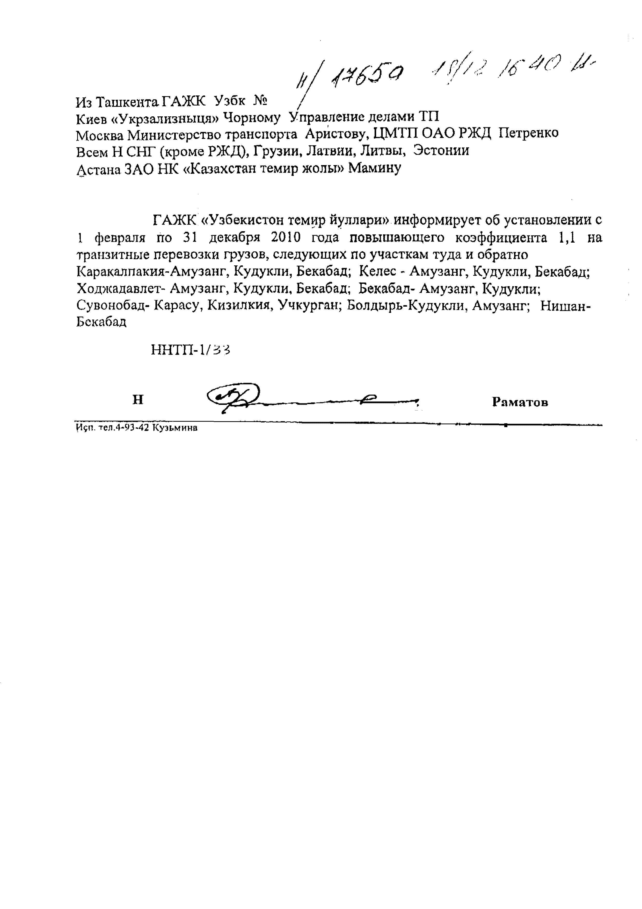 ГАЖК «Узбекистон темир йуллари» информирует об установлении с 1 февраля по 31 декабря 2010 года повышающего коэффициента 1,1 на транзитные перевозки грузов, следующих по участкам туда и обратно Каракалпакия – Амузанг, Кудукли, Бекабад; Келес – Амузанг, Кудукли, Бекабад; Ходжавлет – Амузанг, Кудукли, Бекабад; Бекабад – Амузанг, Кудукли; Сувонобад – Карасу, Кизилкия, Учкурган; Болдырь – Кудукли, Амузанг; Нишан – Бекабад