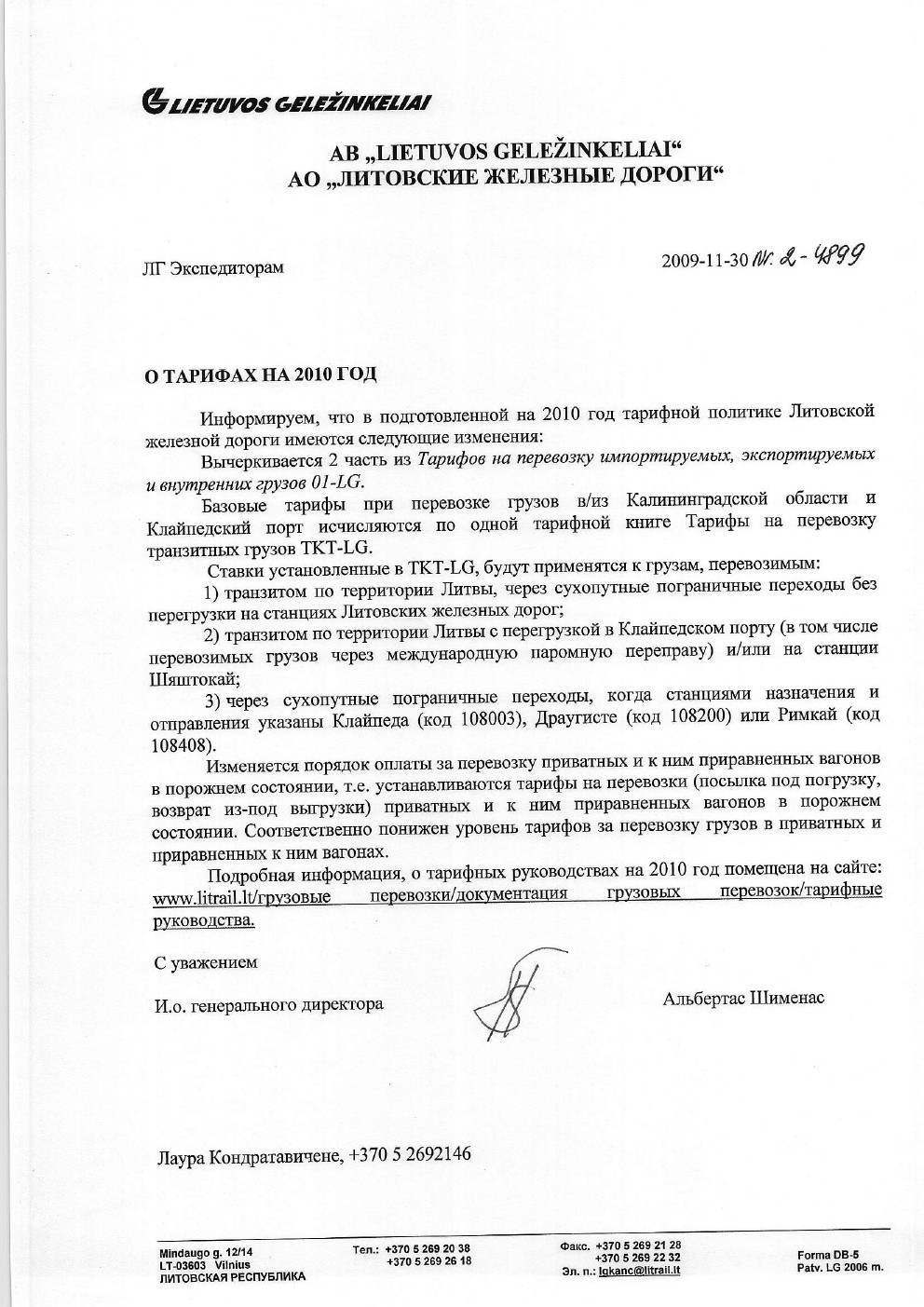 Информируем, что в подготовленной на 2010 год тарифной политике Литовской железной дороги имеются следующие изменения: Вычеркивается 2 часть из Тарифов на перевозку импортируемых, экспортируемых и внутренних грузов 01-LG. Базовые тарифы при перевозке грузов в/из Калининградской области и Клайпедский порт исчисляются по одной тарифной книге Тарифы на перевозку транзитных грузов TKT-LG. Ставки установленные в TKT-LG, будут применятся к грузам, перевозимым: 1) транзитом по территории Литвы, через сухопутные пограничные переходы без перегрузки на станциях Литовских железных дорог; 2) транзитом по территории Литвы с перегрузкой в Клайпедском порту (в том числе перевозимых грузов через международную паромную переправу) и/или на станции Шяштокай; 3) через сухопутные пограничные переходы, когда станциями назначения и отправления указаны Клайпеда (код 108003), Драугисте (код 108200) или Римкай (код 108408). Изменяется порядок оплаты за перевозку приватных и к ним приравненных вагонов в порожнем состоянии, т.е. устанавливаются тарифы на перевозки (посылка под погрузку, возврат из-под выгрузки) приватных и к ним приравненных вагонов в порожнем состоянии. Соответственно понижен уровень тарифов за перевозку грузов в приватных и приравненных к ним вагонах. Подробная информация, о тарифных руководствах на 2010 год помещена на сайте: www.litrail.lt/ грузовые перевозки /документация грузовых перевозок/тарифные руководства.