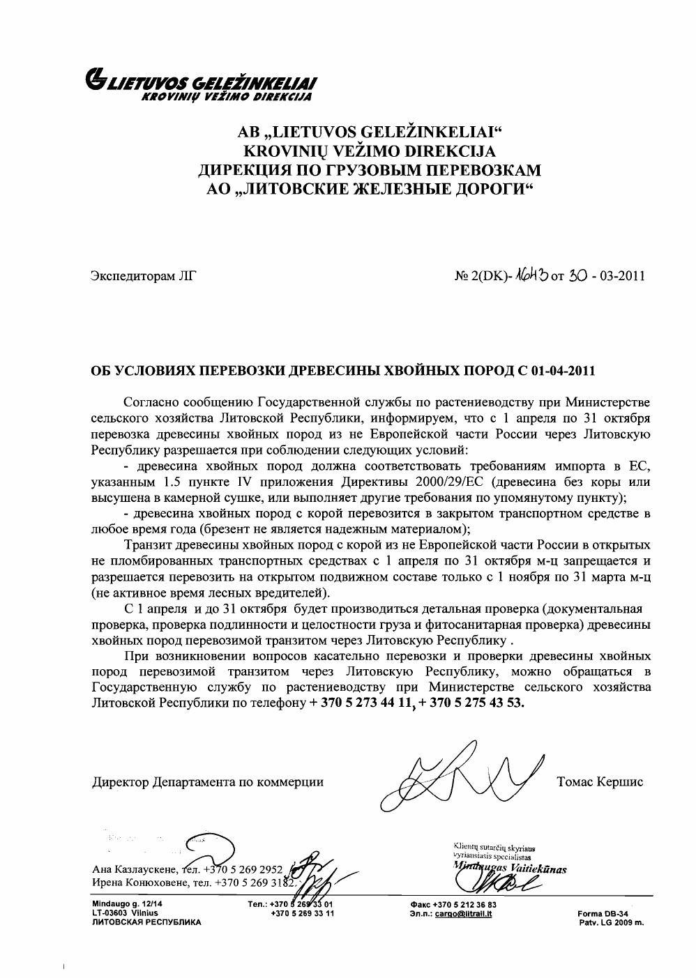Согласно сообщению Государственной службы по растениеводству при Министерстве сельского хозяйства Литовской Республики, информируем, что с 1 апреля по 31 октября перевозка древесины хвойных пород из не Европейской части России через Литовскую Республику разрешается при соблюдении следующих условий: -древесина хвойных пород должна соответствовать требованиям импорта в ЕС, указанным 1.5 пункте IV приложения Директивы 2000/29/ЕС (древесина без коры или высушена в камерной сушке, или выполняет другие требования по упомянутому пункту); -древесина хвойных пород с корой перевозится в закрытом транспортном средстве в любое время года (брезент не является надежным материалом); Транзит древесины хвойных пород с корой из не Европейской части России в открытых не пломбированных транспортных средствах с 1 апреля по 31 октября м-ц запрещается и разрешается перевозить на открытом подвижном составе только с 1 ноября по 31 марта м-ц (не активное время лесных вредителей). С 1 апреля и до 31 октября будет производиться детальная проверка (документальная проверка, проверка подлинности и целостности груза и фитосанитарная проверка) древесины хвойных пород перевозимой транзитом через Литовскую Республику. При возникновении вопросов касательно перевозки и проверки древесины хвойных пород перевозимой транзитом через Литовскую Республику, можно обращаться в Государственную службу по растениеводству при Министерстве сельского хозяйства Литовской Республики по телефону + 370 5 273 44 11, + 370 5 275 43 53.