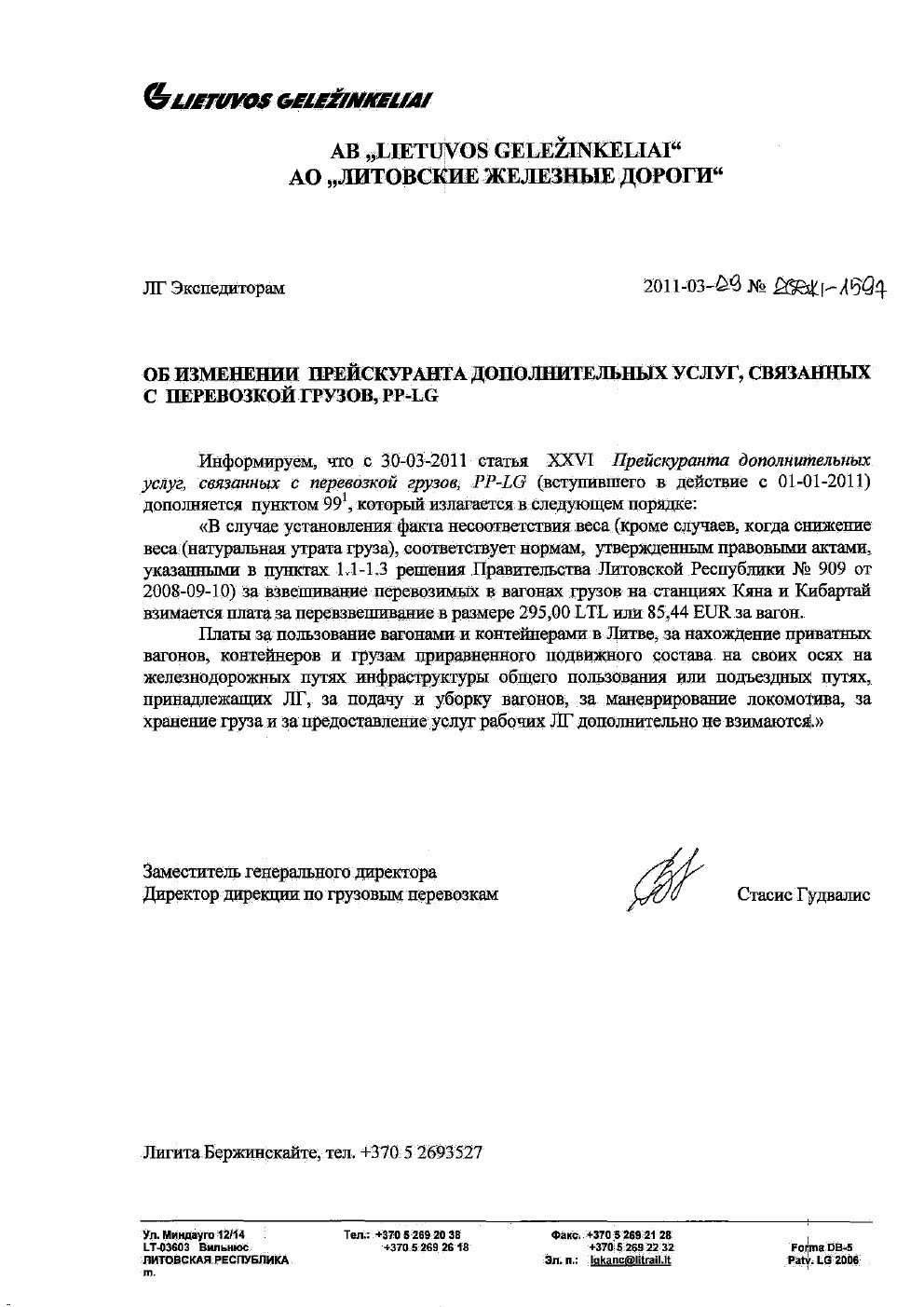 ЛГ Экспедиторам ОБ ИЗМЕНЕНИИ ПРЕЙСКУРАНТА ДОПОЛНИТЕЛЬНЫХ УСЛУГ, СВЯЗАННЫХ С ПЕРЕВОЗКОЙ ГРУЗОВ, PP-LG Информируем, что с 30-03-2011 статья XXVI Прейскуранта дополнительных услуг, связанных с перевозкой грузов, PP-LG (вступившего в действие с 01-01-2011) дополняется пунктом 991, который излагается в следующем порядке: «В случае установления факта несоответствия веса (кроме случаев, когда снижение веса (натуральная утрата груза), соответствует нормам, утвержденным правовыми актами, указанными в пунктах 1.1-1.3 решения Правительства Литовской Республики № 909 от 2008-09-10) за взвешивание перевозимых в вагонах грузов на станциях Кяна и Кибартай взимается плата за перевзвешивание в размере 295,00 LTL или 85,44 EUR за вагон. Платы за пользование вагонами и контейнерами в Литве, за нахождение приватных вагонов, контейнеров и грузам приравненного подвижного состава на своих осях на железнодорожных путях инфраструктуры общего пользования или подъездных путях, принадлежащих ЛГ, за подачу и уборку вагонов, за маневрирование локомотива, за хранение груза и за предоставление услуг рабочих ЛГ дополнительно не взимаются.» Заместитель генерального директора Директор дирекции по грузовым перевозкам Стасис Гудвалис