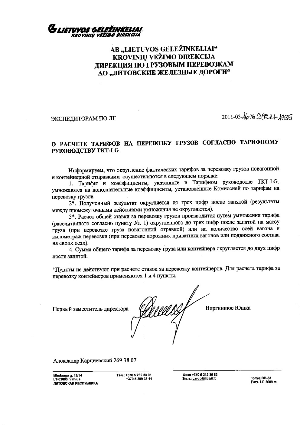 | AB „LIETUVOS GELEŽINKELIAI" KROVINIŲ VEŽIMO DIREKCIJA ДИРЕКЦИЯ ПО ГРУЗОВЫМ ПЕРЕВОЗКАМ АО „ЛИТОВСКИЕ ЖЕЛЕЗНЫЕ ДОРОГИ" ЭКСПЕДИТОРАМ ПО ЛГ 2011-03-16 № 2 (ДК)-1385 О РАСЧЕТЕ ТАРИФОВ НА ПЕРЕВОЗКУ ГРУЗОВ СОГЛАСНО ТАРИФНОМУ РУКОВОДСТВУ ТКТ-LG Информируем, что округление фактических тарифов за перевозку грузов повагонной и контейнерной отправками осуществляются в следующем порядке: 1. Тарифы и коэффициенты, указанные в Тарифном руководстве ТКТ-LG, умножаются на дополнительные коэффициенты, установленные Комиссией по тарифам на перевозку грузов. 2*. Полученный результат округляется до трех цифр после запятой (результаты между промежуточными действиями умножения не округляются). 3*. Расчет общей ставки за перевозку грузов производится путем умножения тарифа (рассчитанного согласно пункту № 1) округленного до трех цифр после запятой на массу груза (при перевозке груза повагонной отправкой) или на количество осей вагона и километраж перевозки (при перевозке порожних приватных вагонов или подвижного состава на своих осях). 4. Сумма общего тарифа за перевозку груза или контейнера округляется до двух цифр после запятой. *Пункты не действуют при расчете ставок за перевозку контейнеров. Для расчета тарифа за перевозку контейнеров применяются 1 и 4 пункты.