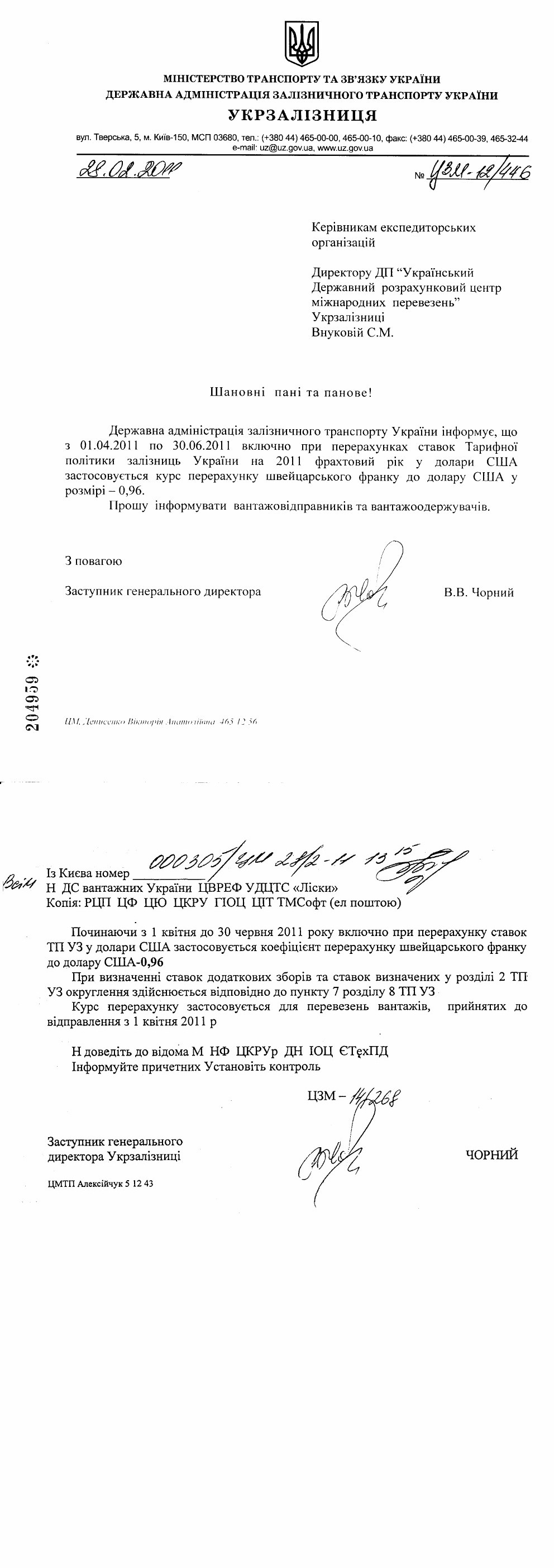 Iз Києва номер 000305/ЦМ 28/2-11 13:15 Н ДС вантажних України ЦВРЕФ УДЦТС «Лiски» Копiя: РЦП ЦФ ЦЮ ЦКРУ ГIОЦ ЦIТ ТМСофт (ел поштою)