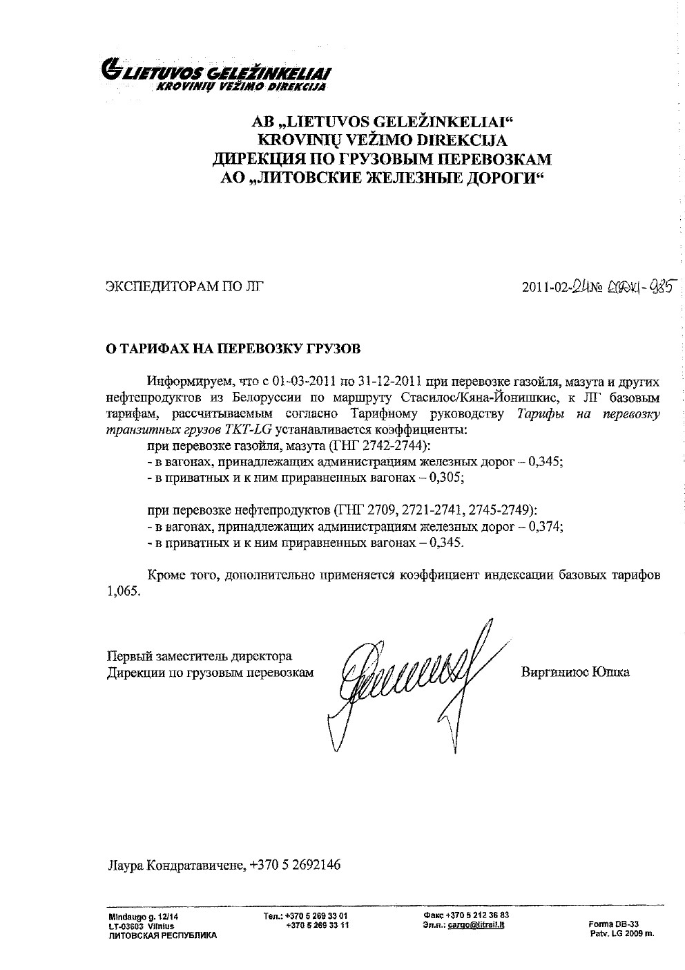 | AB „LIETUVOS GELEŽINKELIAI" KROVINIŲ VEŽIMO DIREKCIJA ДИРЕКЦИЯ ПО ГРУЗОВЫМ ПЕРЕВОЗКАМ АО „ЛИТОВСКИЕ ЖЕЛЕЗНЫЕ ДОРОГИ" ЭКСПЕДИТОРАМ ПО ЛГ 2011-02-24 № 2 (ДК)-985 О ТАРИФАХ НА ПЕРЕВОЗКУ ГРУЗОВ Информируем, что с 01-03-2011 по 31-12-2011 при перевозке газойля, мазута и других нефтепродуктов из Белоруссии по маршруту Стасилос/Кяна-Йонишкис, к ЛГ базовым тарифам, рассчитываемым согласно Тарифному руководству Тарифы на перевозку транзитных грузов ТКТ-LG устанавливается коэффициенты: при перевозке газойля, мазута (ГНГ 2742-2744): - в вагонах, принадлежащих администрациям железных дорог – 0,345; - в приватных и к ним приравненных вагонах – 0,305; при перевозке нефтепродуктов (ГНГ 2709, 2721-2741, 2745-2749): - в вагонах, принадлежащих администрациям железных дорог – 0,374; - в приватных и к ним приравненных вагонах – 0,345.