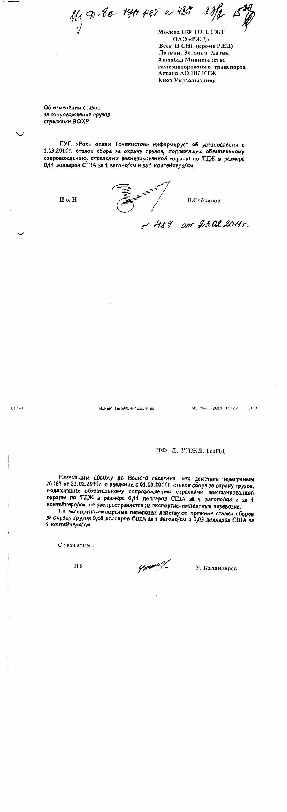Настоящим довожу до Вашего сведения, что действие телеграммы № 487 от 23.02.2011г. о введении с 01.03.2011г. ставок сбора за охрану грузов, подлежащих обязательному сопровождению стрелками военизированной охраны по ТДЖ в размере 0,11 долларов США за 1 вагоно/км и за 1 контейнеро/км не распространяется на экспортно-импортные перевозки. На экспортно-импортные-перевозки действуют прежние ставки сборов за охрану грузов 0,08 долларов США за 1 вагоно/км и 0,03 долларов США за 1 контейнеро/км.
