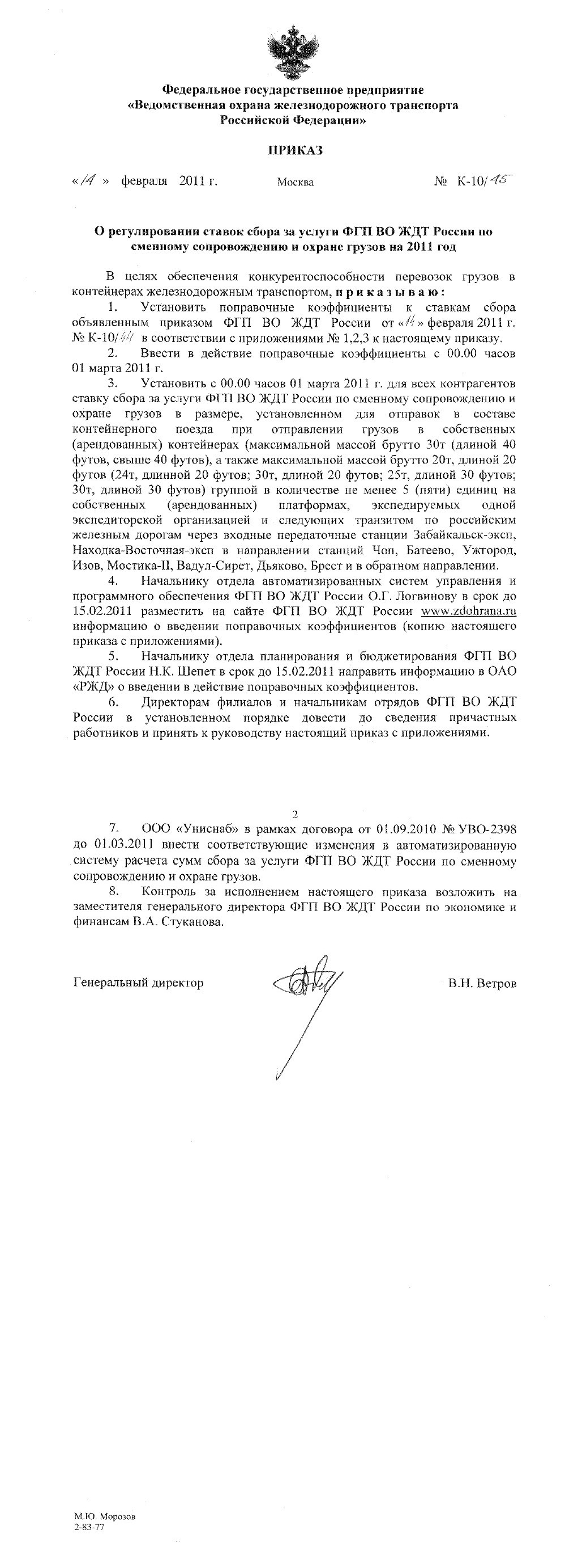 В целях обеспечения конкурентоспособности перевозок грузов в контейнерах железнодорожным транспортом, приказываю: 1. Установить поправочные коэффициенты к ставкам сбора объявленным приказом ФГП ВО ЖДТ России от «14» февраля 2011 г. № К-10/44 в соответствии с приложениями № 1,2,3 к настоящему приказу. 2. Ввести в действие поправочные коэффициенты с 00.00 часов 01 марта 2011 г. 3. Установить с 00.00 часов 01 марта 2011 г. для всех контрагентов ставку сбора за услуги ФГП ВО ЖДТ России по сменному сопровождению и охране грузов в размере, установленном для отправок в составе контейнерного поезда при отправлении грузов в собственных (арендованных) контейнерах (максимальной массой брутто 30т (длиной 40 футов, свыше 40 футов), а также максимальной массой брутто 20т, длиной 20 футов (24т, длинной 20 футов; 30т, длиной 20 футов; 25т, длиной 30 футов; 30т, длиной 30 футов) группой в количестве не менее 5 (пяти) единиц на собственных (арендованных) платформах, экспедируемых одной экспедиторской организацией и следующих транзитом по российским железным дорогам через входные передаточные станции Забайкальск-эксп, Находка-Восточная-эксп в направлении станций Чоп, Батеево, Ужгород, Изов, Мостика-II, Вадул-Сирет, Дьяково, Брест и в обратном направлении. 4. Начальнику отдела автоматизированных систем управления и программного обеспечения ФГП ВО ЖДТ России О.Г. Логвинову в срок до 15.02.2011 разместить на сайте ФГП ВО ЖДТ России www.zdohrana.ru информацию о введении поправочных коэффициентов (копию настоящего приказа с приложениями). 5. Начальнику отдела планирования и бюджетирования ФГП ВО ЖДТ России Н.К. Шепет в срок до 15.02.2011 направить информацию в ОАО «РЖД» о введении в действие поправочных коэффициентов. 6. Директорам филиалов и начальникам отрядов ФГП ВО ЖДТ России в установленном порядке довести до сведения причастных работников и принять к руководству настоящий приказ с приложениями. 7. ООО «Униснаб» в рамках договора от 01.09.2010 № УВО-2398 до 01.03.2011 внести соответствующие изменения в автоматизированную систему расчета сумм сбора за услуги ФГП ВО ЖДТ России по сменному сопровождению и охране грузов. 8. Контроль за исполнением настоящего приказа возложить на заместителя генерального директора ФГП ВО ЖДТ России по экономике и финансам В.А. Стуканова.
