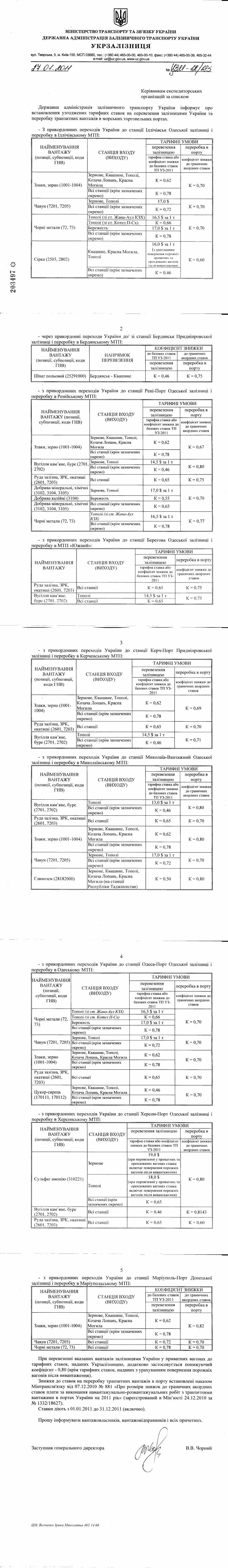 | МIНIСТЕРСТВО ТРАНСПОРТУ ТА ЗВ’ЯЗКУ УКРАЇНИ ДЕРЖАВНА АДМIНIСТРАЦIЯ ЗАЛIЗНИЧНОГО ТРАНСПОРТУ УКРАЇНИ УКРЗАЛIЗНИЦЯ вул. Тверська, 5, м. Київ-150, МСП 03680, тел.: (+380 44) 465-00-00, 465-00-10, факс: (+380 44) 465-00-39, 465-32-44 e-mail: uz@uz.gov.ua, www.uz.gov.ua __________________________________________________________________ 27.01.2011 № ЦЗМ – 12/183 Керівникам експедиторських організацій за списком Державна адміністрація залізничного транспорту України інформує про встановлення узгоджених тарифних ставок на перевезення залізницями України та переробку транзитних вантажів в морських торговельних портах. -З прикордонних переходiв України до станцiї Iллiчiвськ Одеської залiзницi i переробку в Iллiчiвському МТП: | НАЙМЕНУВАННЯ ВАНТАЖУ (позиції, субпозиції, коди ГНВ) | СТАНЦІЯ ВХОДУ (ВИХОДУ) | ТАРИФНІ УМОВИ | | перевезення залізницею | переробка в порту | | тарифна ставка або коефіцієнт знижки до базових ставок ТП У3-2011 | коефіцієнт знижки до граничних акордних ставок | | Злаки, зерно (1001-1004) | Зернове, Квашине, Тополі, Козача Лопань, Красна Могила | К = 0.62 | К = 0,70 | | Всі станції (крім зазначених окремо) | К = 0,78 | | Чавун (7201,7205) | Зернове, Тополі | 17,0 $ | К = 0.70 | | Всі станції (крім зазначених окремо) | К = 0,72 | | Чорні метали (72, 73) | Тополі (зі ст. Жана-Аул КЗХ) | 16.5 $ за 1 т | К = 0,70 | | Тополі (зі ст. Котел П-Сх) | К = 0,66 | | Бережесть | 17.0 $ за 1 т | | Всі станції (крім зазначених окремо) | К = 0.78 | | Сірка(2503, 2802) | Квашине, Красна Могила. Тополі | 16.0 $ за 1 т (з урахуванням повернення порожніх приватних та орендованих вагонiв після вивантаження) | К = 0.60 | | Всі станції (крім зазначених окремо) | К = 0.46 | Через прикордоннi переходи України до/зi станцiї Бердянськ Приднiпровської залiзницi i переробку в Бердянському МТП: | НАЙМЕНУВАННЯ ВАНТАЖУ (позиції, субпозиції, коди ГНВ) | НАПРЯМОК ПЕРЕВЕЗЕННЯ | КОЕФІЦІЄНТ ЗНИЖКИ | | до базових ставок ТП УЗ-2011 | до граничних акордних ставок | | перевезення залізницею | переробка в порту | | Шпат польовий (25291000) | Бердянськ - Квашине | К = 0.46 | К = 0.75 | -з прикордонних переходiв України до станцiї Ренi-Порт Одеської залiзницi i перероюку в Ренiйському МТП: | НАЙМЕНУВАННЯ ВАНТАЖУ (позиції, субпозиції, коди ГНВ) | СТАНЦІЯ ВХОДУ (ВИХОДУ) | ТАРИФНІ УМОВИ | | перевезення залізницею | переробка в порту | | тарифна ставка або коефіцієнт знижки до базових ставок ТП УЗ-2011 | коефіцієнт знижки до граничних акордних ставок | | Злаки, зерно (1001-1004) | Зернове, Квашине, Тополі, Козача Лопань, Красна Могила | К = 0,62 | К = 0.67 | | Всі станції (крім зазначених окремо) | К = 0,78 | | Вугілля кам’яне, буре (2701, 2702) | Зернове. Тополі | 14,5 $ за 1 т | К = 0,80 | | Всі станції (крім зазначених окремо) | К = 0,46 | | Руда залізна, ЗРК, окатиші (2601,7203) | Всі станції | К = 0,65 | К = 0,75 | | Добрива мінеральні, хімічні (3102,3104.3105) | Зернове, Тополі | 17,0 $ за 1 т | К = 0,70 | | Добрива калійні (3104) | Бережесть | К = 0.55 | | Добрива мінеральні, хімічні (3102,3104,3105) | Всі станції (крім зазначених окремо) | К = 0,65 | | Чорні метали (72. 73) | Тополі (зі ст. Жана-Аул КЗХ) | 16,5 $ за 1 т | К = 0,77 | | Всі станції (крім зазначених окремо) | К = 0.78 | -з прикордонних переходiв України до станцiї Берегова Одеської залiзницi i переробку в МТП «Южний»: | НАЙМЕНУВАННЯ ВАНТАЖУ | СТАНЦІЯ ВХОДУ (ВИХОДУ) | ТАРИФНІ УМОВИ | | перевезення залізницею | переробка в порту | | тарифна ставка або коефіцієнт знижки до базових ставок ТП УЗ- 2011 | коефіцієнт знижки до граничних акордних ставок | | Руда залізна. ЗРК. окатиші (2601. 7203) | Всі станції | К = 0.65 | К - 0.75 | | Вугілля кам’яне. буре (2701. 2702) | Тополі | 14.5 $ за 1 т | К = 0.75 | | Всі станції | К = 
