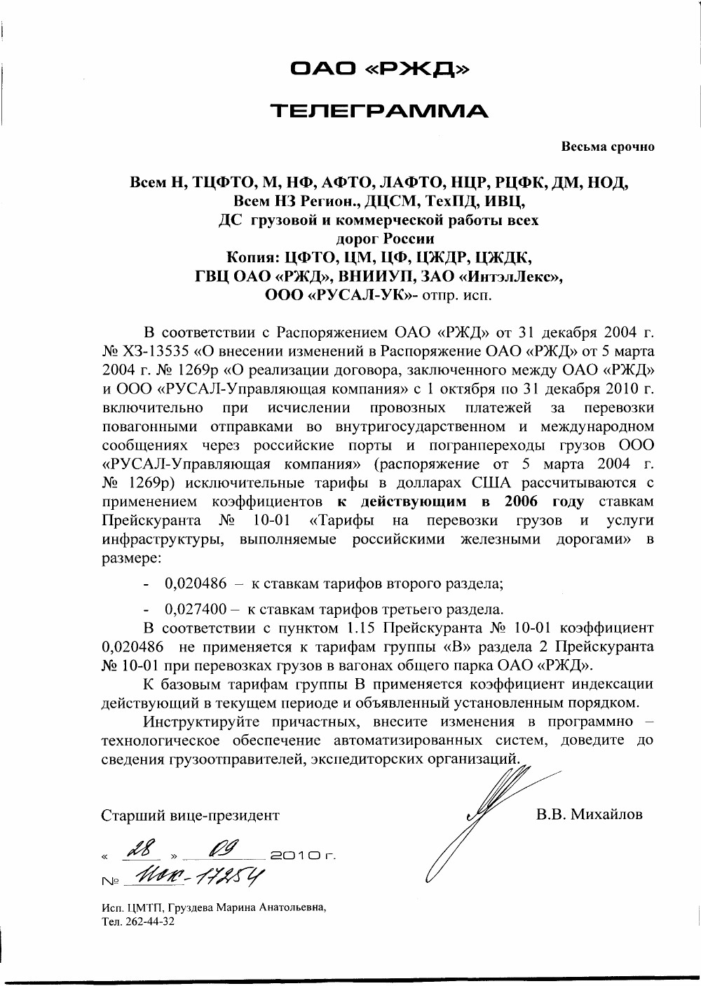| ОАО «РЖД» ТЕЛЕГРАММА Весьма срочно Всем Н, ТЦФТО, М, НФ, АФТО, ЛАФТО, НЦР, РЦФК, ДМ, НОД, Всем НЗ Регион., ДЦСМ, ТехПД, ИВЦ, ДС грузовой и коммерческой работы всех дорог России Копия: ЦФТО, ЦМ, ЦФ, ЦЖДР, ЦЖДК, ГВЦ ОАО «РЖД», ВНИИУП, ЗАО «ИнтэлЛекс», ООО «РУСАЛ-УК»- отпр. исп. В соответствии с Распоряжением ОАО «РЖД» от 31 декабря 2004 г. № ХЗ-13535 «О внесении изменений в Распоряжение ОАО «РЖД» от 5 марта 2004 г. № 1269р «О реализации договора, заключенного между ОАО «РЖД» и ООО «РУСАЛ-Управляющая компания» с 1 октября по 31 декабря 2010 г. включительно при исчислении провозных платежей за перевозки повагонными отправками во внутригосударственном и международном сообщениях через российские порты и погранпереходы грузов ООО «РУСАЛ-Управляющая компания» (распоряжение от 5 марта 2004 г. № 1269р) исключительные тарифы в долларах США рассчитываются с применением коэффициентов к действующим в 2006 году ставкам Прейскуранта № 10-01 «Тарифы на перевозки грузов и услуги инфраструктуры, выполняемые российскими железными дорогами» в размере: - 0,020486 - к ставкам тарифов второго раздела; - 0,027400 - к ставкам тарифов третьего раздела. В соответствии с пунктом 1.15 Прейскуранта № 10-01 коэффициент 0,020486 не применяется к тарифам группы «В» раздела 2 Прейскуранта № 10-01 при перевозках грузов в вагонах общего парка ОАО «РЖД». К базовым тарифам группы В применяется коэффициент индексации действующий в текущем периоде и объявленный установленным порядком. Инструктируйте причастных, внесите изменения в программно - технологическое обеспечение автоматизированных систем, доведите до сведения грузоотправителей, экспедиторских организаций. Старший вице-президент В.В. Михайлов « 28 » 09. 2010 г. № ИСК-17254