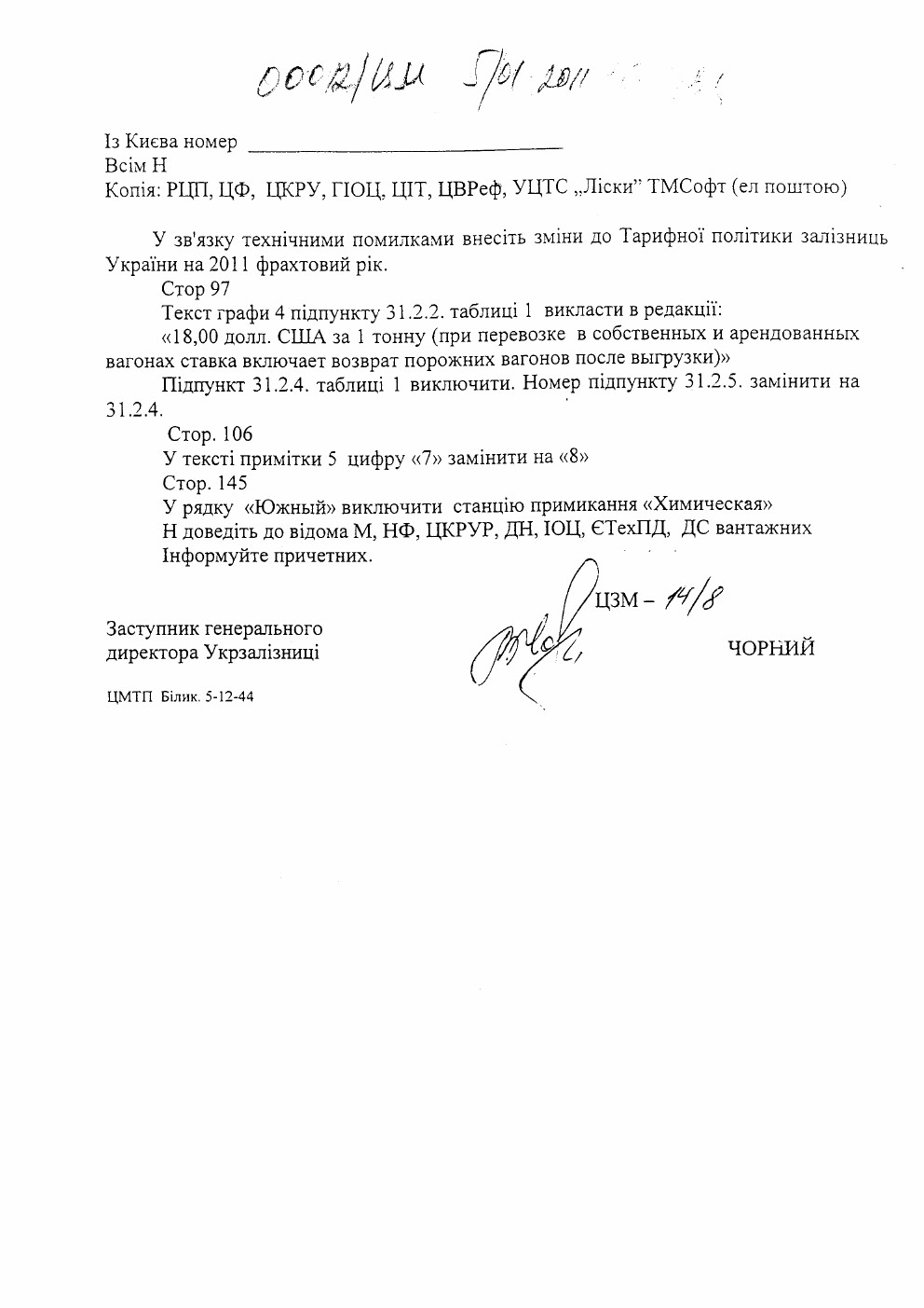 У зв’язку технiчними помилками внесiть змiни до Тарифної полiтики залiзниць України на 2011 фрахтовий рiк. Стор 97 Текст графи 4 пiдпункту 31.2.2. таблицi 1 викласти в редакцiї: «18,00 долл. США за 1 тонну (при перевозке в собственных и арендованных вагонах ставка включает возврат порожних вагонов после выгрузки)» Пiдпункт 31.2.4. таблицi 1 виключити. Номер пiдпункту 31.2.5. замiнити на 31.2.4. Стор. 106 У текстi примiтки 5 цифру «7» замiнити на «8» Стор. 145 У рядку «Южный» виключити станцiю примикання «Химическая» Н доведiть до вiдома М, НФ, ЦКРУР, ДН, IОЦ, €ТехПД, ДС вантажних Iнформуйте причетних.