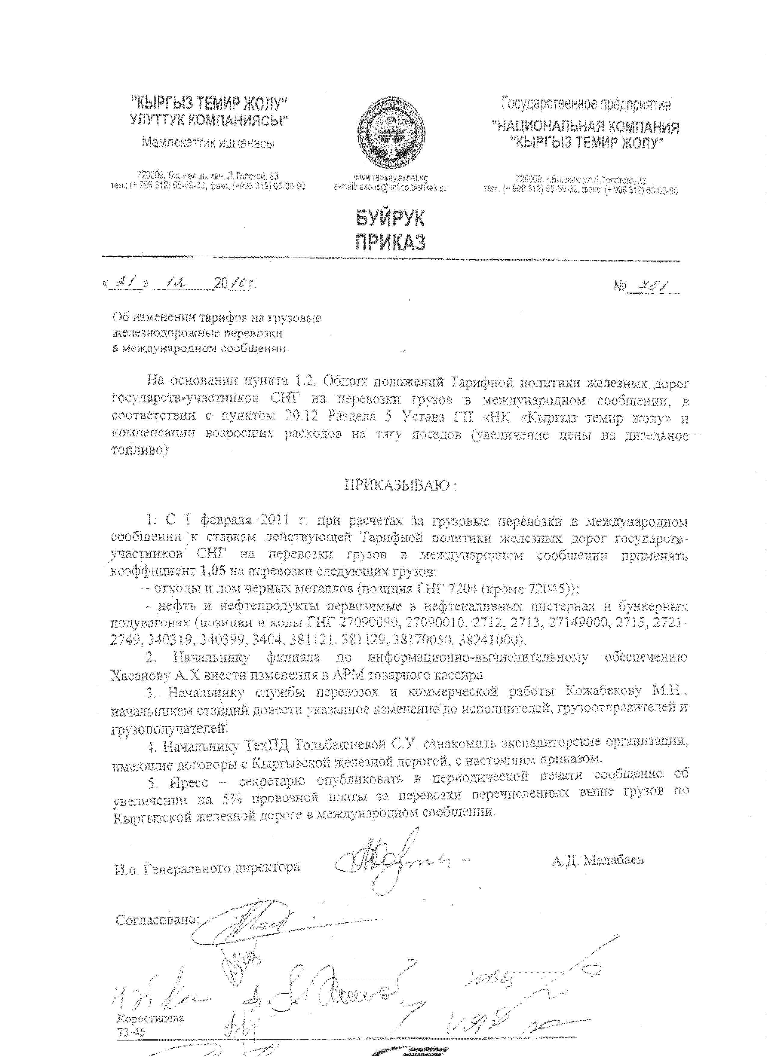 1. С 1 февраля 2011 г. при расчетах за грузовые перевозки в международном сообщении к ставкам действующей Тарифной политики железных дорог государств-участников СНГ на перевозки грузов в международном сообщении применять коэффициент 1,05 на перевозки следующих грузов: - отходы и лом черных металлов (позиция ГНГ 7204 (кроме 72045)); - нефть и нефтепродукты перевозимые в нефтеналивных цистернах и бункерных полувагонах (позиции и коды ГНГ 27090090, 27090010, 2712, 2713, 27149000, 2715, 2721-2749, 340319, 340399, 3404, 381121, 381129, 38170050, 38241000). 2. Начальнику филиала по информационно-вычислительному обеспечению Хасанову А.Х. внести изменения в АРМ товарного кассира. 3. Начальнику службы перевозок и коммерческой работы Кожабекову М.Н., начальникам станций довести указанное изменение до исполнителей, грузоотправителей и грузополучателей. 4. Начальнику ТехПД Тольбашиевой С.У. ознакомить экспедиторские организации, Имеющие договоры с Кыргызской железной дорогой, с настоящим приказом. 5. Пресс – секретарю опубликовать в периодической печати сообщение об увеличении на 5% провозной платы за перевозки перечисленных выше грузов по Кыргызской железной дороге в международном сообщении. И.о. Генерального директора А.Д. Малабаев Коростилева 73-45
