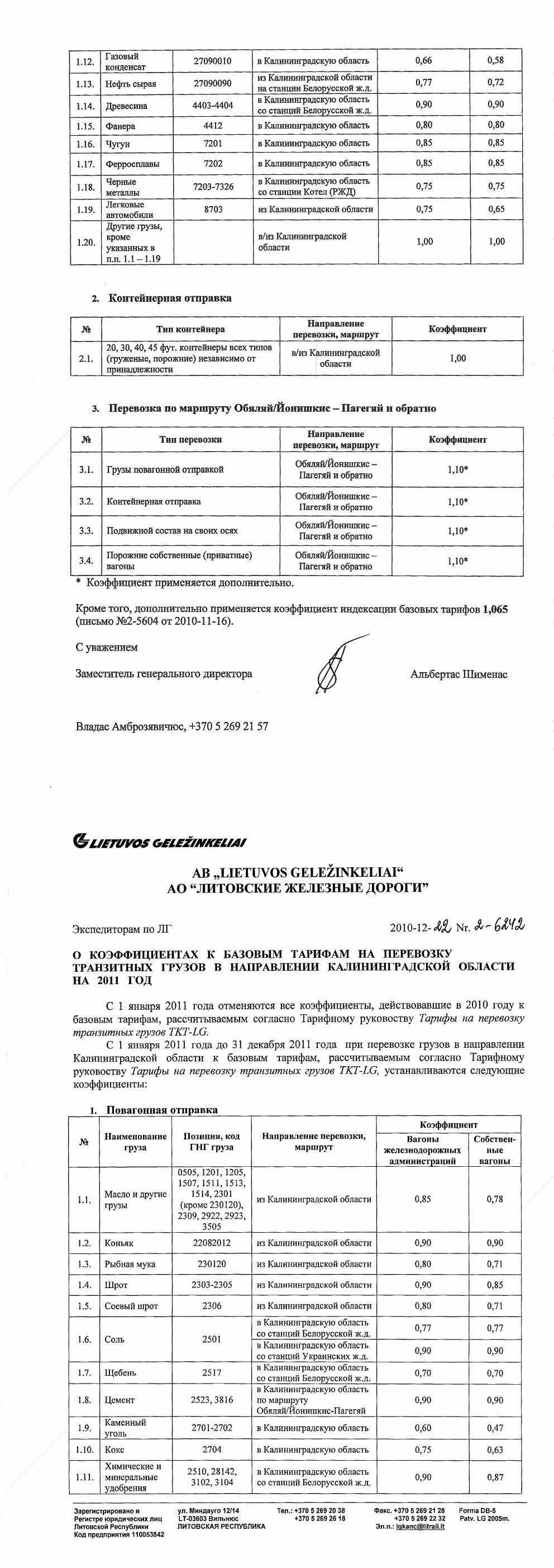 | . АВ «LIETUVOS GELEŽINKELIAI» AO «ЛИТОВСКИЕ ЖЕЛЕЗНЫЕ ДОРОГИ» Экспедиторам по ЛГ 2010-12-22 № 2-6242 О КОЭФФИЦИЕНТАХ К БАЗОВЫМ ТАРИФАМ НА ПЕРЕВОЗКУ ТРАНЗИТНЫХ ГРУЗОВ В НАПРАВЛЕНИИ КАЛИНИНГРАДСКОЙ ОБЛАСТИ НА 2011 ГОД С 1 января 2011 года отменяются все коэффициенты, действовавшие в 2010 году к базовым тарифам, рассчитываемым согласно Тарифному руководству Тарифы на перевозку транзитных грузов ТКТ-LG. С 1 января 2011 года до 31 декабря 2011 года при перевозке грузов в направлении Калининградской области к базовым тарифам, рассчитываемым согласно Тарифному руководству Тарифы на перевозку транзитных грузов ТКТ-LG, устанавливаются следующие коэффициенты: 1. Повагонная отправка | № | Наименование груза | Позиция, код ГНГ груза | Направление перевозки, маршрут | Коэффициент | | Вагоны железнодорожных администраций | Собственные вагоны | | 1.1. | Масло и другие грузы | 0505, 1201, 1205, 1507, 1511, 1513, 1514, 2301 (кроме 230120), 2309, 2922, 2923, 3505 | из Калининградской области | 0,85 | 0,78 | | 1.2. | Коньяк | 22082012 | из Калининградской области | 0,90 | 0,90 | | 1.3. | Рыбная мука | 230120 | из Калининградской области | 0,80 | 0,71 | | 1.4. | Шрот | 2303-2305 | из Калининградской области | 0,90 | 0,85 | | 1.5. | Соевый шрот | 2306 | из Калининградской области | 0,80 | 0,71 | | 1.6. | Соль | 2501 | в Калининградскую область | 0,77 | 0,77 | | в Калининградскую область со станций Украинских ж.д. | 0,90 | 0,90 | | 1.7. | Щебень | 2517 | в Калининградскую область со станций Белорусской ж.д. | 0,70 | 0,70 | | 1.8. | Цемент | 2523, 3816 | в Калининградскую область по маршруту Обяляй/Йонишкис-Пагегяй | 0,90 | 0,90 | | 1.9. | Каменный уголь | 2701-2702 | в Калининградскую область | 0,60 | 0,47 | | 1.10. | Кокс | 2704 | в Калининградскую область | 0,75 | 0,63 | | 1.11. | Химические и минеральные удобрения | 2510, 28142, 3102, 3104 | в Калининградскую область со станций Белорусской ж.д. | 0,90 | 0,87 | | 1.12. | Газовый конденсат | 27090010 | в Калининградскую область | 0,66 | 0,58 | | 1.13. | Нефть сырая | 27090090 | из Калининградской области на станции Белорусской ж.д. | 0,77 | 0,72 | | 1.14. | Древесина | 4403-4404 | в Калининградскую область со станций Белорусской ж.д. | 0,90 | 0,90 | | 1.15. | Фанера | 4412 | в Калининградскую область | 0,80 | 0,80 | | 1.16. | Чугун | 7201 | в Калининградскую область | 0,85 | 0,85 | | 1.17. | Ферросплавы | 7202 | в Калининградскую область | 0,85 | 0,85 | | 1.18. | Черные металлы | 7203-7326 | в Калининградскую область со станции Котел (РЖД) | 0,75 | 0,75 | | 1.19. | Легковые автомобили | 8703 | из Калининградской области | 0,75 | 0,65 | | 1.20. | Другие грузы, кроме указанных в п.п. 1.1-1.19 | | в/из Калининградской области | 1,00 | 1,00 | 2. Контейнерная отправка | № | Тип контейнера | Направление перевозки, маршрут | Коэффициент | | 2.1. | 20, 30, 40, 45 фут. Контейнеры всех типов (груженные, порожние) независимо от принадлежности | в/из Калининградской области | 1,00 | 3. Перевозка по маршруту Обяляй/Йонишкис – Пагегяй и обратно | № | Тип контейнера | Направление перевозки, маршрут | Коэффициент | | 3.1. | Грузы повагонной отправкой | Обяляй/Йонишкис – Пагегяй и обратно | 1,10* | | 3.2. | Контейнерная отправка | Обяляй/Йонишкис – Пагегяй и обратно | 1,10* | | 3.3. | Подвижной состав на своих осях | Обяляй/Йонишкис – Пагегяй и обратно | 1,10* | | 3.4. | Порожние собственные (приватные) вагоны | Обяляй/Йонишкис – Пагегяй и обратно | 1,10* | * Коэффициент применяется дополнительно. Кроме того, дополнительно применяется коэффициент индексации базовых тарифов 1,065 (письмо № 2 – 5604 от 2010 – 11 – 16). С уважением Заместитель генерального директора Альбертас Шименас Владас Амброзявичюс, +370 5 269 21 57 Зарегистрировано в ул. Миндауго 12/14 Тел.: +370 5 269 20 38 