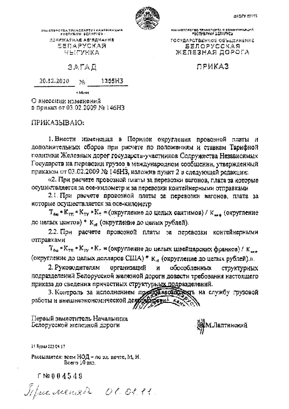 ПРИКАЗЫВАЮ: Внести изменения в Порядок округления провозной платы и дополнительных сборов при расчете по положениям и ставкам Тарифной политики Железных дорог государств-участников Содружества Независимых Государств на перевозки грузов в международном сообщении, утвержденный приказом от 03.02.2009 № 146НЗ, изложив пункт 2 в следующей редакции: «2. При расчете провозной платы за перевозки вагонов, плата за которые осуществляется за осе-километр и за перевозки контейнерными отправками 2.1. При расчете провозной платы за перевозки вагонов, плата за которые осуществляется за осе-километр Т К К К =(округление до целых сантимов)/ К (округление до целых центов) К (округление до целых рублей). 2.2. При расчете провозной платы за перевозки контейнерными отправками Т К К К =(округление до целых швейцарских франков)/ К (округление до целых долларов США) К (округление до целых рублей)». Руководителям организаций и обособленных структурных подразделений Белорусской железной дороги довести требования настоящего приказа до сведения причастных структурных подразделений. Контроль за исполнением приказа возложить на службу грузовой работы и внешнеэкономической деятельности.