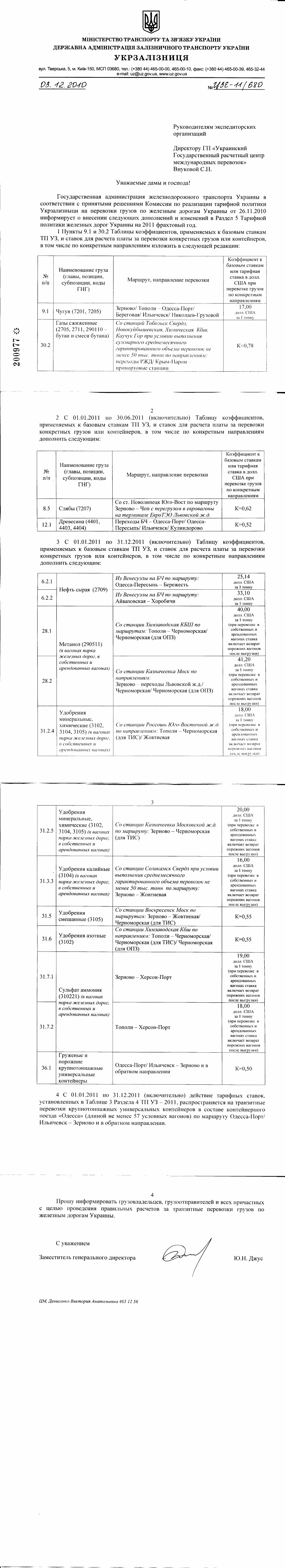 | ЦЗЕ-11/677 от 03.12.2010 Руководителям экспедиторских организаций Директору ГП «Украинский Государственный расчетный центр международных перевозок» Внуковой С.Н. Уважаемые дамы и господа! Государственная администрация железнодорожного транспорта Украины в соответствии с принятыми решениями Комиссии по реализации тарифной политики Укрзализныци на перевозки грузов по железным дорогам Украины от 26.11.2010 информирует о следующем. По 31.03.2011 (включительно) продлевается действие тарифов, установленных на перевозки руды железной, ЖРК, окатышей со станций Российской Федерации с 01.07.2010 при условии выполнения в указанном периоде консолидированного гарантированного среднемесячного объема перевозок в размере не менее 800 тыс. тонн или выполнения среднемесячного объема перевозок не менее 400 тыс. тонн одним оператором перевозок. В связи с этим вносятся следующие дополнения в Таблицу коэффициентов, применяемых к базовым ставкам ТП УЗ, и ставок для расчета платы за перевозки конкретных грузов или контейнеров, в том числе по конкретным направлениям Раздела 5 Тарифной политики железных дорог Украины на 2011 фрахтовый год: | № п/п | Наименование груза (главы, позиции, субпозиции, коды ГНГ) | Маршрут, направление перевозки | Коэффициент к базовым ставкам или тарифная ставка в долл. США при перевозке грузов по конкретным направлениям | | 4.1 | Руда железная, ЖРК, окатыши (2601, 7203) из Российской Федерации | Зерново – Чоп/ Ужгород | 15,97 долл. США за 1 тонну | | 4.2 | Зерново – Мостиска ІІ | 14,52 долл. США за 1 тонну | | 4.3 | Зерново – Батево | 15,86 долл. США за 1 тонну | | 4.4 | Зерново – Дьяково | 17,00 долл. США за 1 тонну | | 4.5 | Зерново – Изов/ Ильичевск/ Береговая/ Одесса-Порт | 14,42 долл. США за 1 тонну | | 4.6 | Зерново – Измаил | 17,15 долл. США за 1 тонну | | 4.7 | Зерново – Рени-экс | 13,39 долл. США за 1 тонну | | 4.8 | Зерново – Николаев-Грузовой | 12,88 долл. США за 1 тонну | | 4.9 | Тополи – Чоп/ Батево | 19,26 долл. США за 1 тонну | | 4.10 | Тополи – Ужгород | 19,47 долл. США за 1 тонну | | 4.11 | Тополи – Изов | 17,00 долл. США за 1 тонну | | 4.12 | Тополи – Мостиска ІІ | 17,10 долл. США за 1 тонну | | 4.13 | Тополи – Ильичевск | 13,91 долл. США за 1 тонну | | 4.14 | Тополи – Береговая/ Одесса-Порт/ Керчь-Порт | 13,39 долл. США за 1 тонну | | 4.15 | Тополи – Николаев-Грузовой | 11,33 долл. США за 1 тонну | | 4.16 | Тополи – Измаил | 16,07 долл. США за 1 тонну | | 4.17 | Тополи – Рени-экс | 13,60 долл. США за 1 тонну | | 4.18 | Тополи/ Зерново – Рени-Порт | 13,65 долл. США за 1 тонну | | 4.19 | Казачья Лопань – Чоп | 17,82 долл. США за 1 тонну | | 4.20 | Казачья Лопань – Батево | 17,87 долл. США за 1 тонну | | 4.21 | Казачья Лопань – Ужгород | 18,03 долл. США за 1 тонну | | 4.22 | Казачья Лопань – Мостиска ІІ | 15,97 долл. США за 1 тонну | | 4.23 | Казачья Лопань – Изов | 15,45 долл. США за 1 тонну | | 4.24 | Казачья Лопань – Береговая/ Керчь-Порт/ Ильичевск | 11,85 долл. США за 1 тонну | | 4.25 | Казачья Лопань – Николаев-Грузовой | 10,61 долл. США за 1 тонну | | 4.26 | Казачья Лопань – Рени-экс/ Рени-Порт | 13,39 долл. США за 1 тонну | | 4.27 | Удрицк – Батево | 10,93 долл. США за 1 тонну | При перевозках в собственных и арендованных вагонах указанные тарифы учитывают возврат вагонов в порожнем состоянии. Прошу информировать грузовладельцев, грузоотправителей и всех причастных с целью проведения правильных расчетов за транзитные перевозки грузов по железным дорогам Украины. С уважением Заместитель генерального директора Ю.Н. Джус ЦМ, Денисенко Виктория Анатольевна 465 12 56 МIНIСТЕРСТВО ТРА