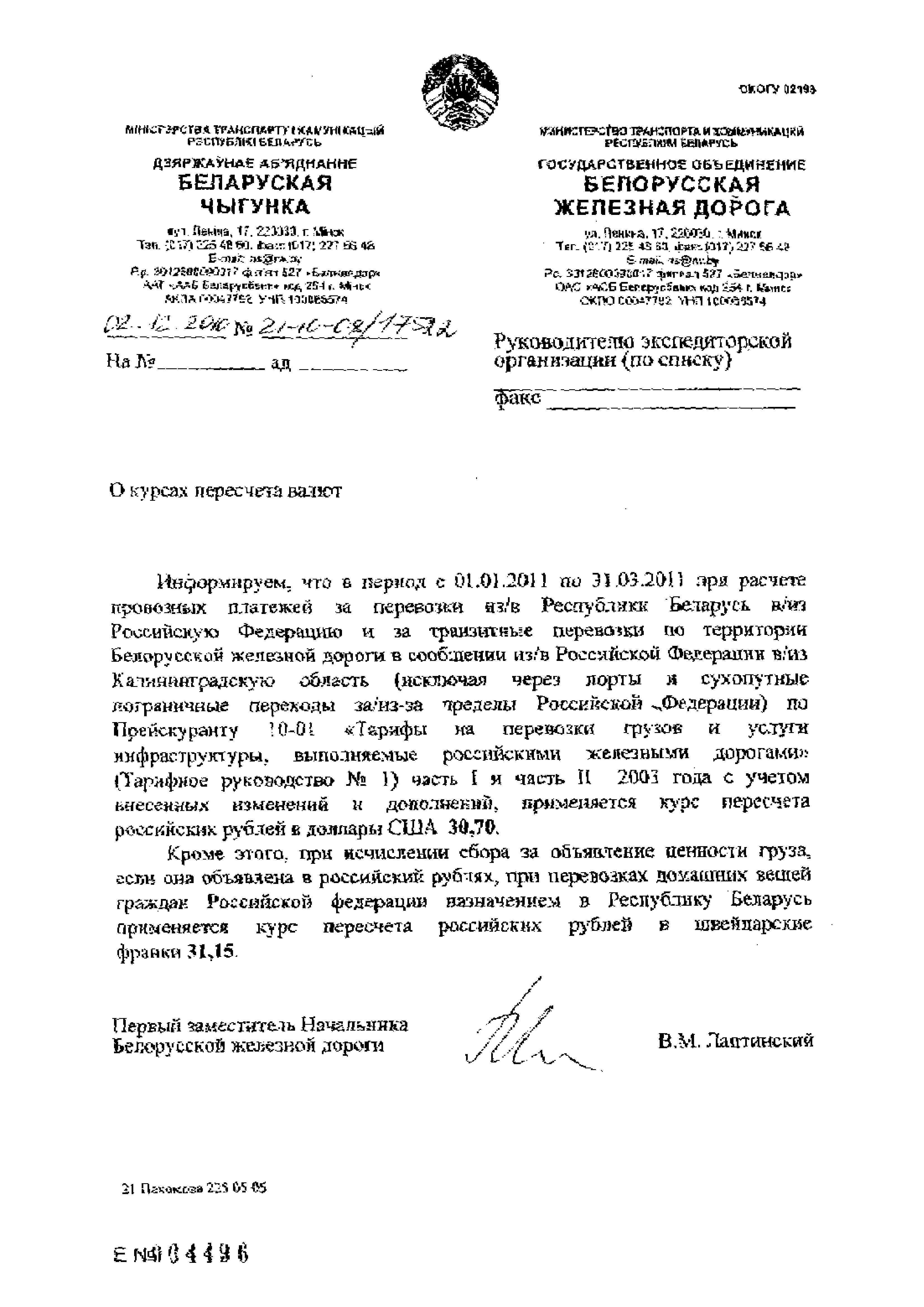 Информируем, что в период с 01.01.2011 по 31.03.2011 при расчете провозных платежей за перевозки из/в Республики Беларусь в/из Российской федерации и за транзитной перевозки по территории Белорусской железной дороги в сообщении из/в Российской Федерации в/из Калининградскую область (исключая через порты и сухопутные пограничные переходы за/из – за пределы Российской Федерации) по Прейскуранту 10,01 «Тарифы на перевозке грузов и услуги инфраструктуры, выполняемые российскими железными дорогами» (Тарифное руководство № 1) часть I и часть II 2003 года с учетом внесенных изменений и дополнений, применяется курс пересчета российских рублей в доллары США 30,70. Кроме этого, при исчислении сбора за объявление ценности груза, если она объявлена в российских рублях, при перевозках домашних вещей граждан Российской федерации назначением в Республику Беларусь применяется курс пересчета российских рублей в швейцарские франки 31,15.